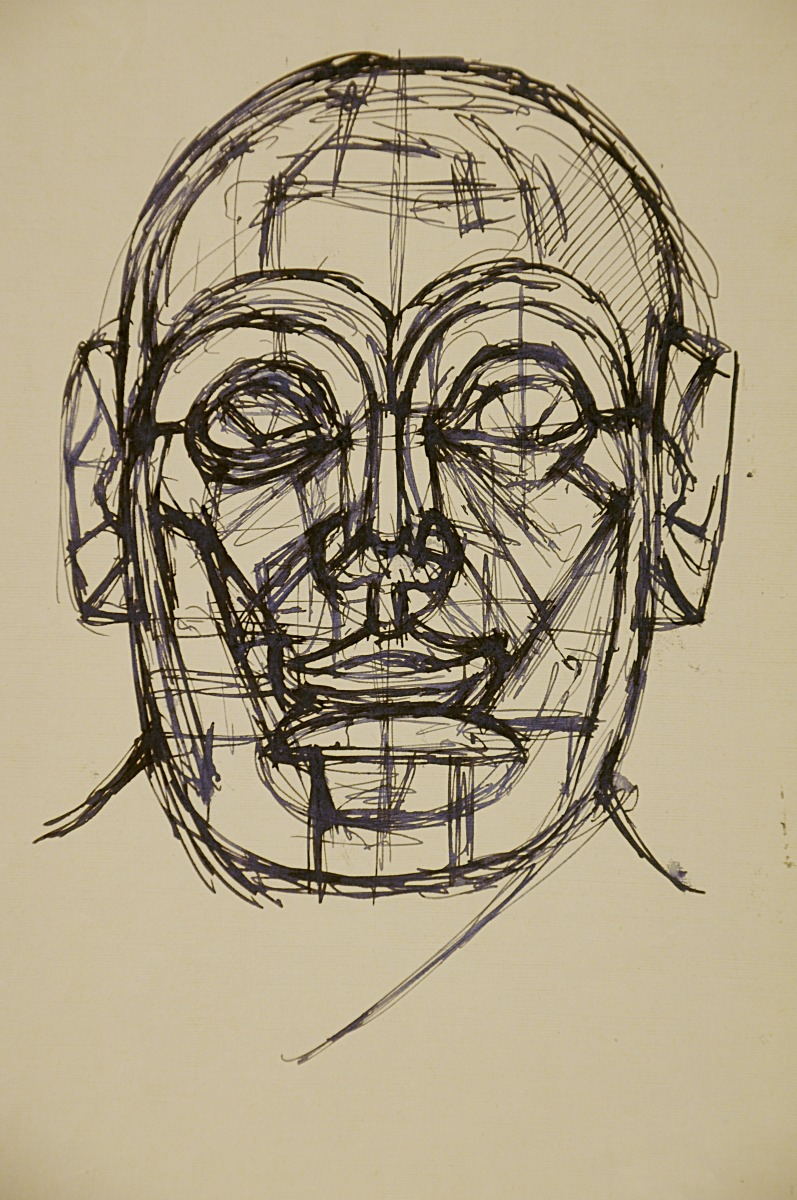 Cette tête de Gudea, prince de Lagash, statue assise dédiée au dieu Ningishzida (AGD n° 1712) n'est pas égyptienne, mais sumérienne. Elle date de 2.120 avant J.-C., et est conservée au Louvre depuis 1881. Elle se caractérise par un grand schématisme. Familière à l'artiste, Giacometti possède un exemplaire chez lui, du Gudea à " la tête rasée ", qu'il a acheté au Louvre en 1925, et qui est reproduit sur une Nature morte dans l'atelier de 1927. Il a conservé cette tête comme " référent " jusqu'à la fin de sa vie. Agnès de La Baumelle (Alberto Giacometti, le dessin à l'uvre, Paris, Gallimard, Centre Pompidou, 2001, p. 219), commissaire de l'exposition Le dessin à l'uvre, à Paris en 2001, y voit un absolu indépassable qui contribue à expliquer son abandon du travail d'après modèle en 1927 et son aventure surréaliste. C'est donc un " vieil ami ", qui n'a paradoxalement jamais quitté son atelier, que retrouve Giacometti lorsqu'il reprend son étude en 1937.
