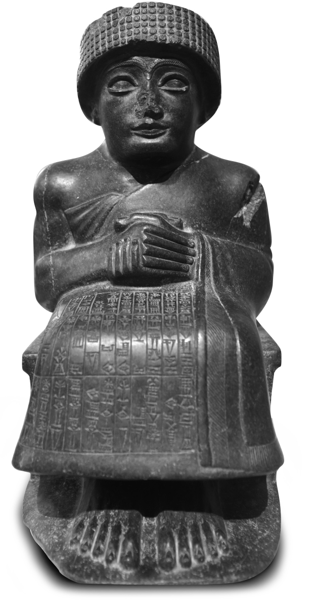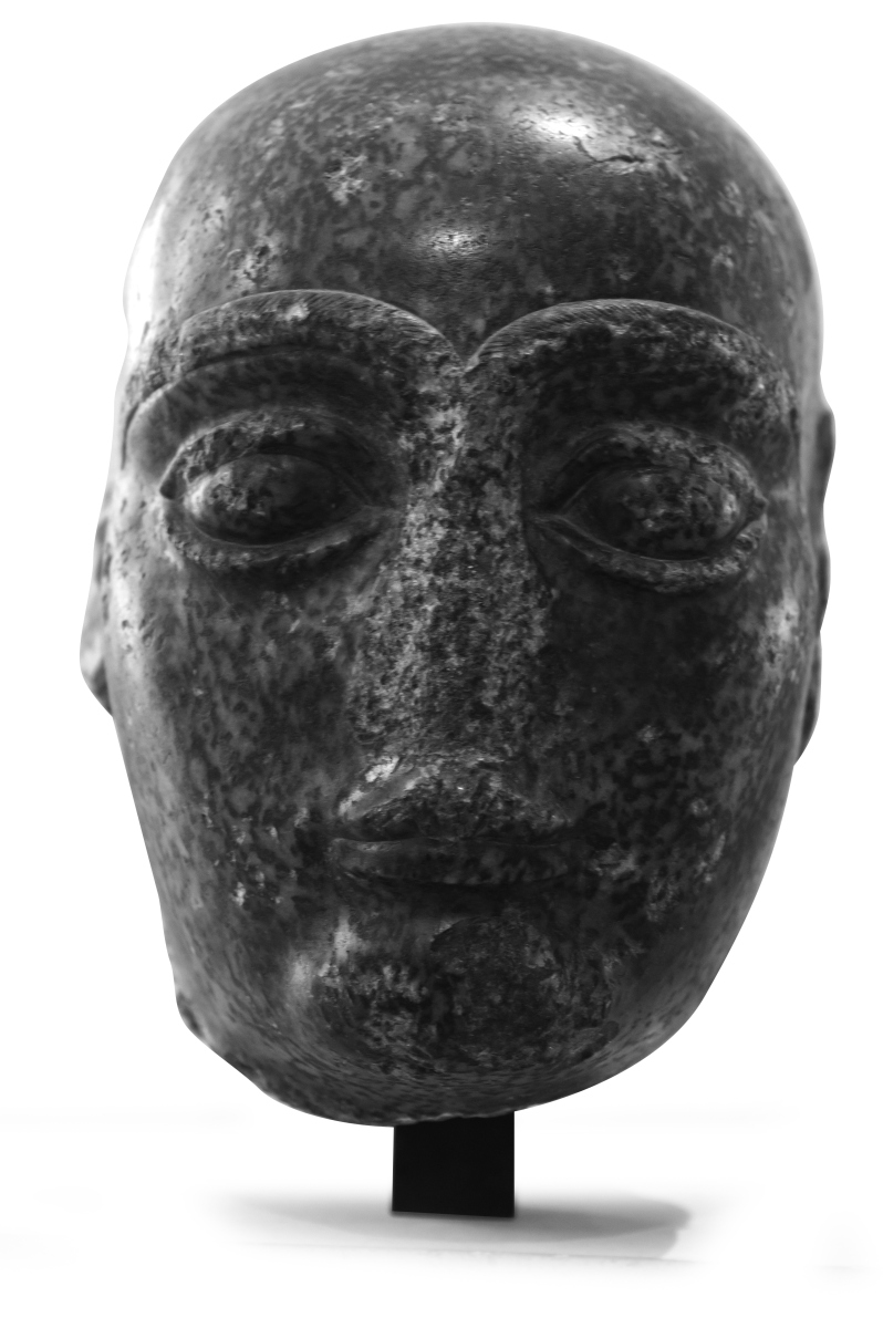 Tête de la sculpture sumérienne de Gudea conservée au musée du Louvre (Gudea, prince de Lagash, statue assise dédiée au dieu Ningishzida, diorite, vers 2120 avant J.-C., Haut. 46 cm).