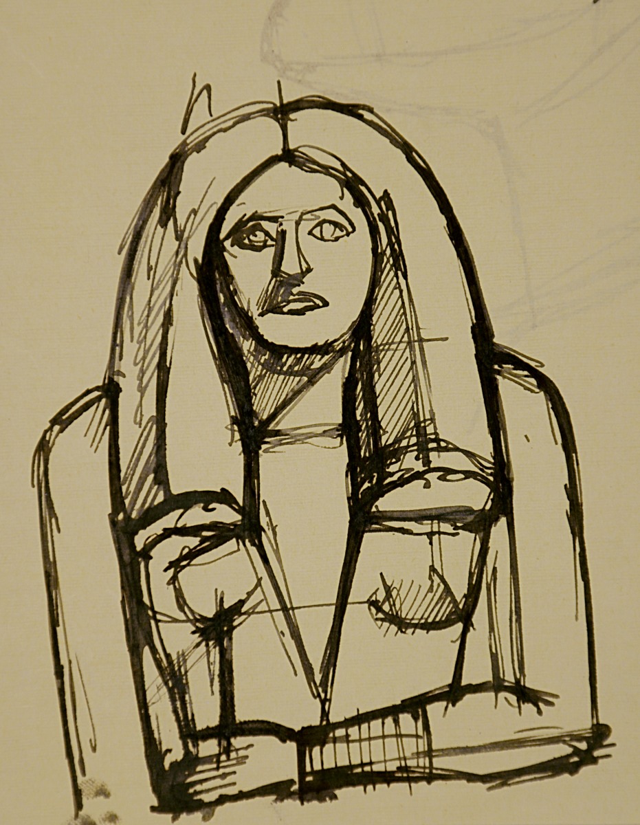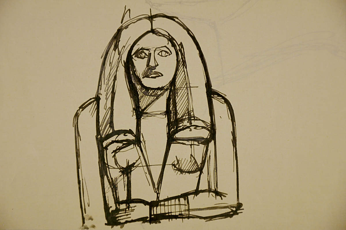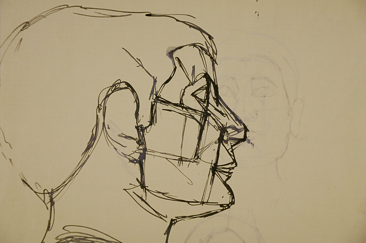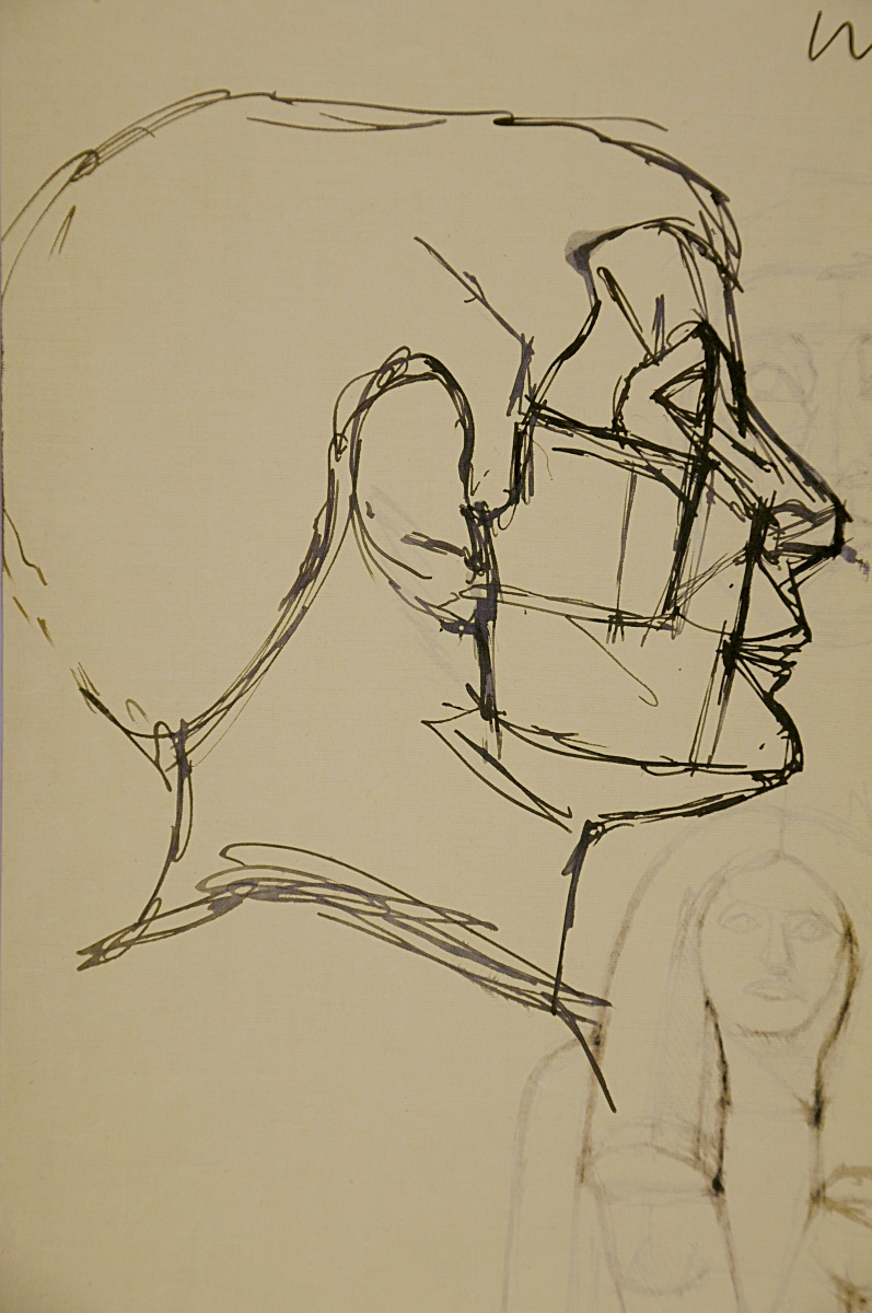 Giacometti s'intéresse au visage du Scribe accroupi du Louvre (AGD n° 1709). Ce visage est dessiné au recto et au verso, accompagné du buste de la Dame Nesa et de profil au verso de la page. Cette figure célèbre, créée vers 2.620-2.500 av J.-C. présente au Louvre depuis 1854 grâce à un don du gouvernement égyptien, est facilement identifiable grâce à la précision du trait de Giacometti, son souci du détail donné au visage (expressions, formes, proportions), et la position si caractéristique de la sculpture. On retrouve la même représentation de face et de profil sur le dessin AGD n° 1710, mais l'uvre originale reste malheureusement non identifiée. S'agit-il également du Scribe accroupi? Pourquoi pas?
