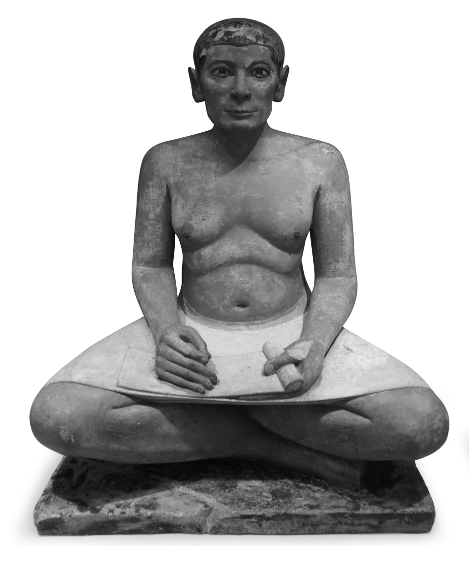 Deux sculptures égyptiennes, conservées au musée du Louvre: Dame Nesa (Dame Nesa, calcaire peint, calcaire peint, 2.700-2.620 avant J.-C., Haut. 154 cm) et le Scribe accroupi (Le Scribe accroupi, calcaire peint et yeux incrus-tés, vers 2.620-2.500 av J.-C. Haut.: 53,7 cm).