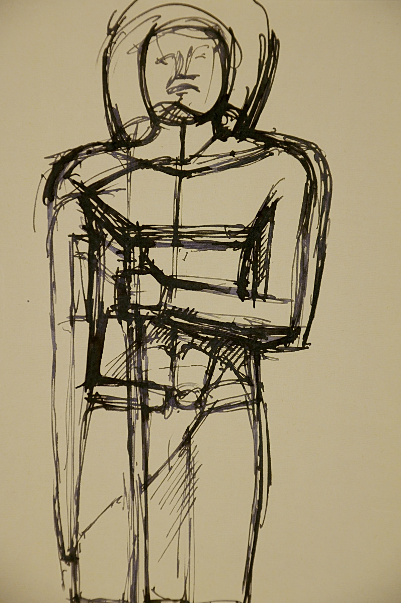 La statue de Sepa, "grand des dizaines du Sud" est représentée à trois reprises dans la collection Tériade - Joannides (AGD n°1704, 1706, 1720). Ce calcaire peint datant de 2.700 - 2.600 avant J.-C. est exposé au Louvre, à proximité de la Dame Nesa (AGD n°1709) dont elle est contemporaine, mais beaucoup plus grande par la taille. C'est en effet une sculpture importante qui mesure 169 cm de hauteur. Giacometti insiste sur la position particulière des bras, l'un est tendu et l'autre replié tenant un grand bâton ou sceptre. Giacometti insiste également au niveau du buste avec des traits de crayon beaucoup plus prononcés. Ce que retient Giacometti, ce sont le côté très carré des épaules et l'aspect monolithique de la figure.