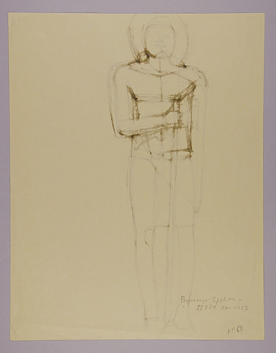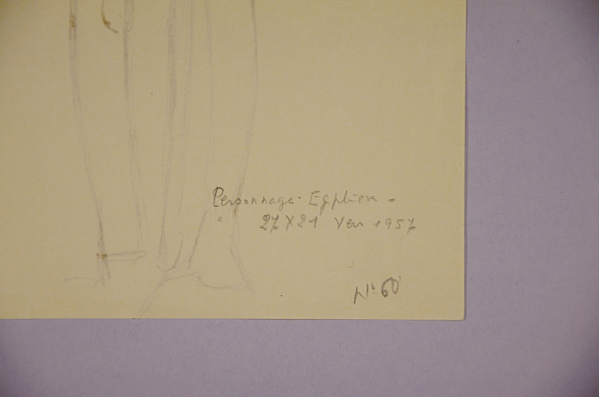 Mentions manuscrites au crayon au dos en bas: "Personnage Egyptien. / 27 x 21 vers 1957 / N°: 60".