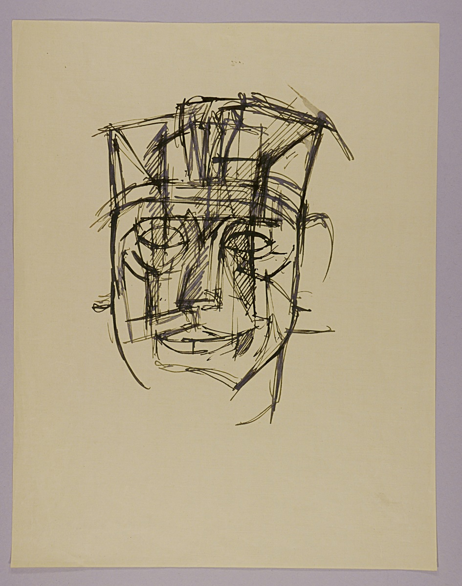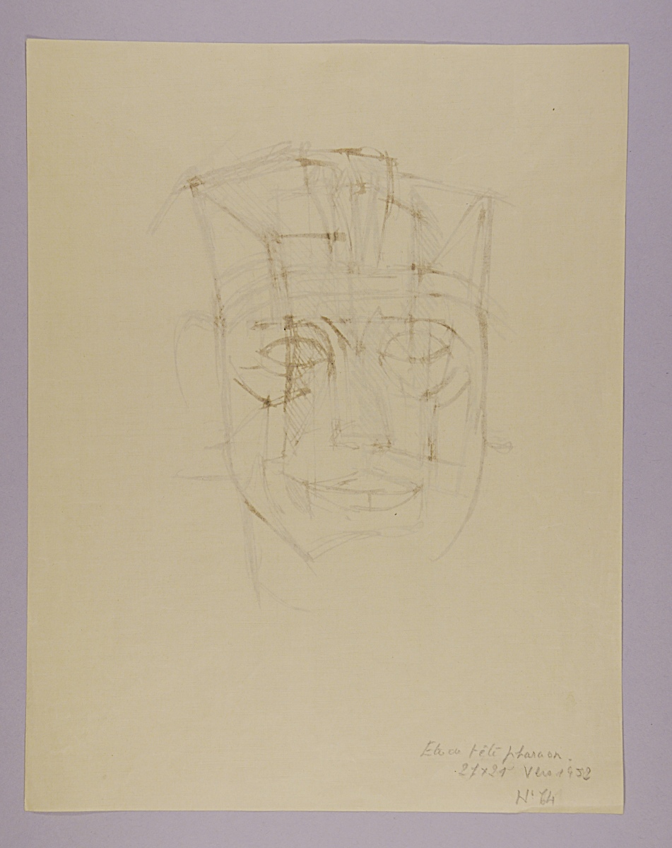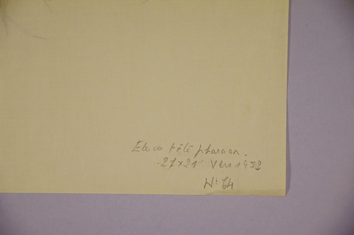 Mentions manuscrites au crayon au dos en bas: "Étude tête pharaon. / 27 x 21 Vers 1952 / N°64".