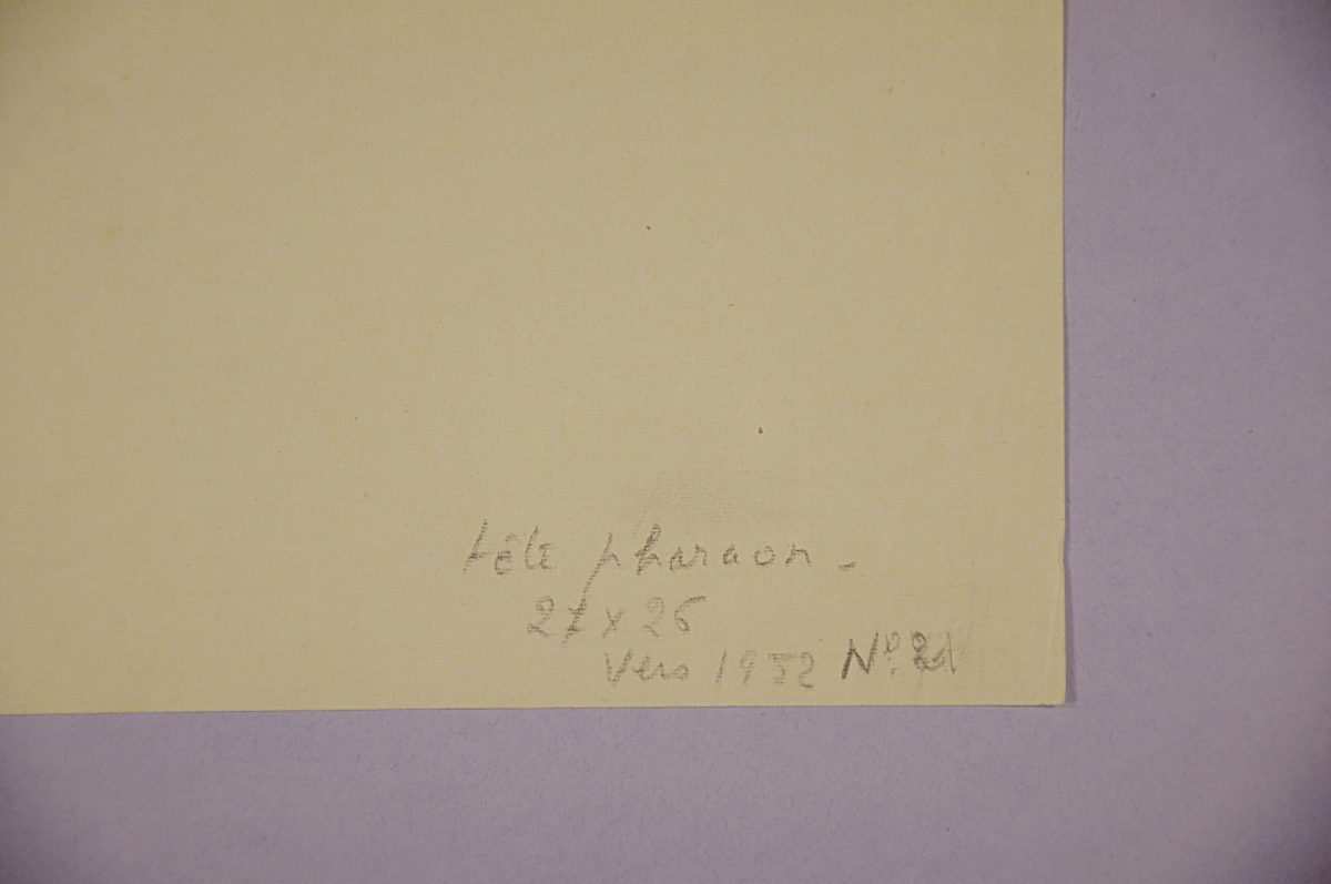 Mentions manuscrites au crayon au dos en bas: "tête pharaon. / Egyptien / 27 x 21 vers 1952 / N 21".