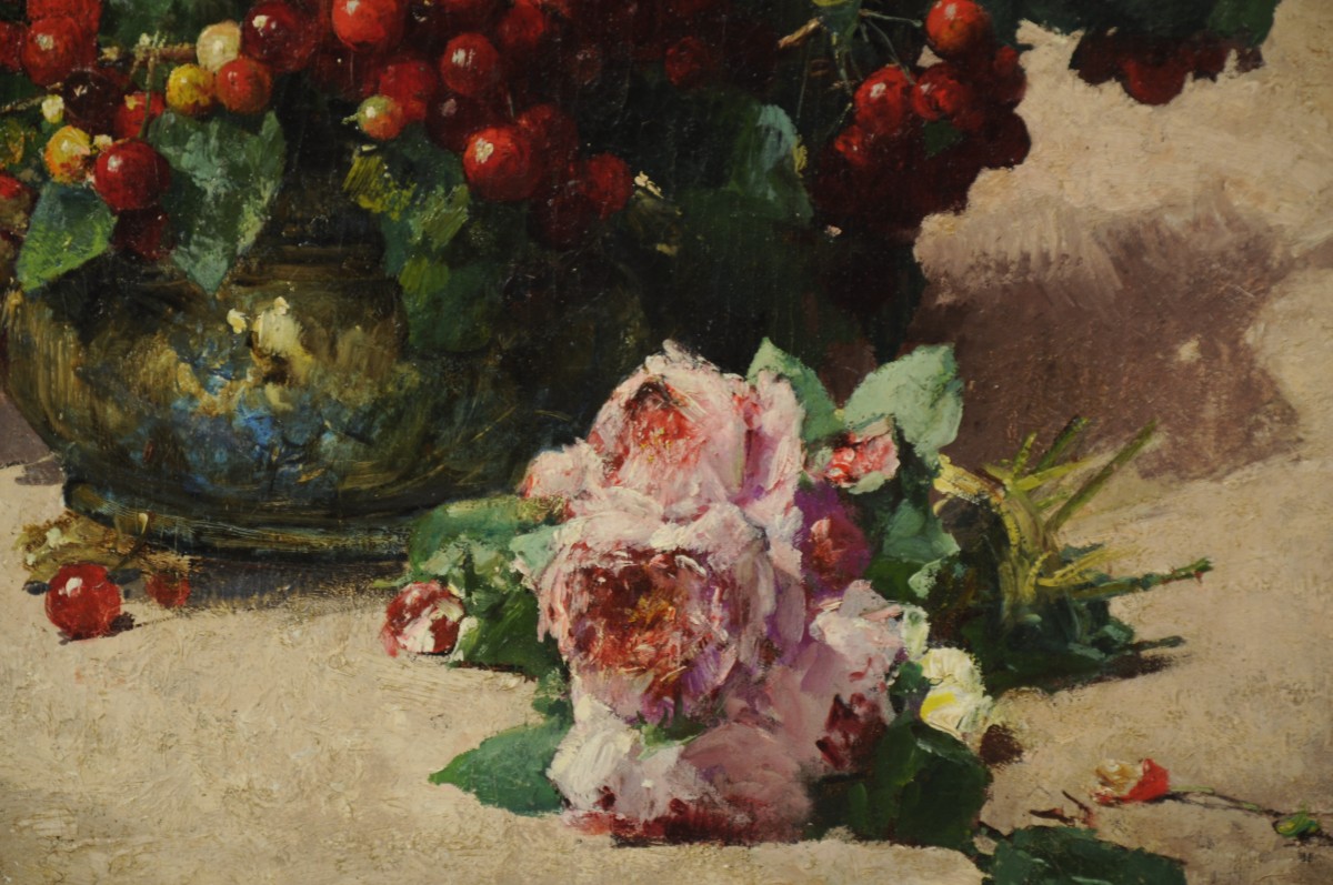 Bouquet de cerises aux pivoines.