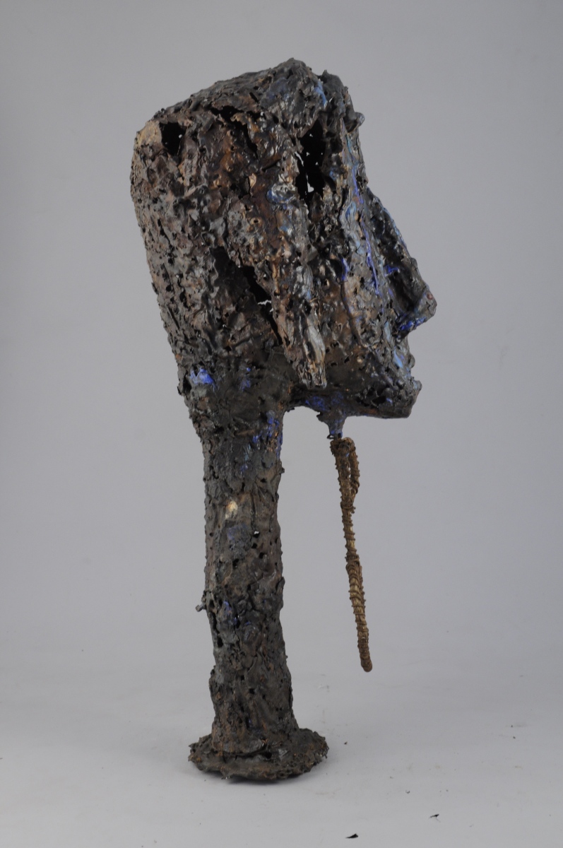 Sculpture en grillage, plastique fondu et incrusté, fibres végétales et peinture.