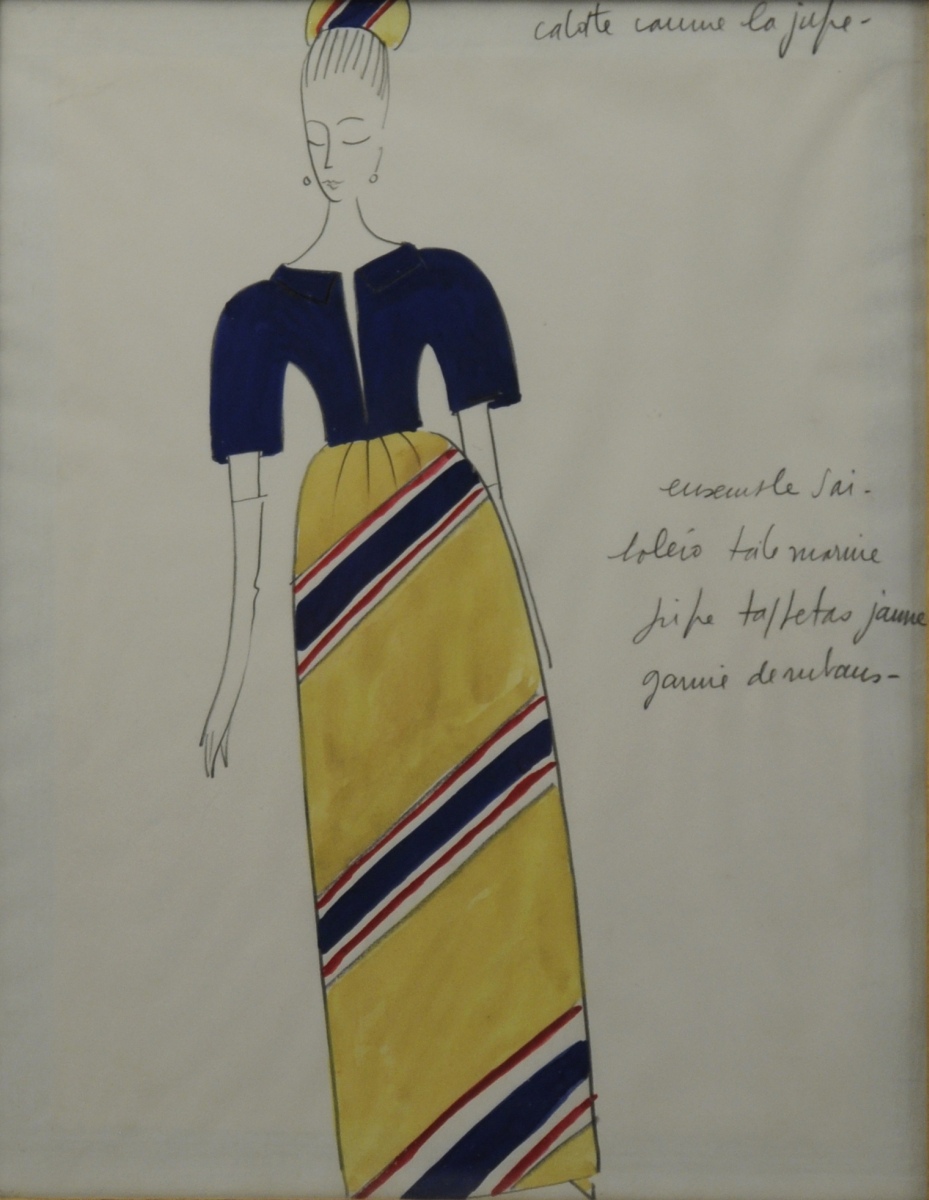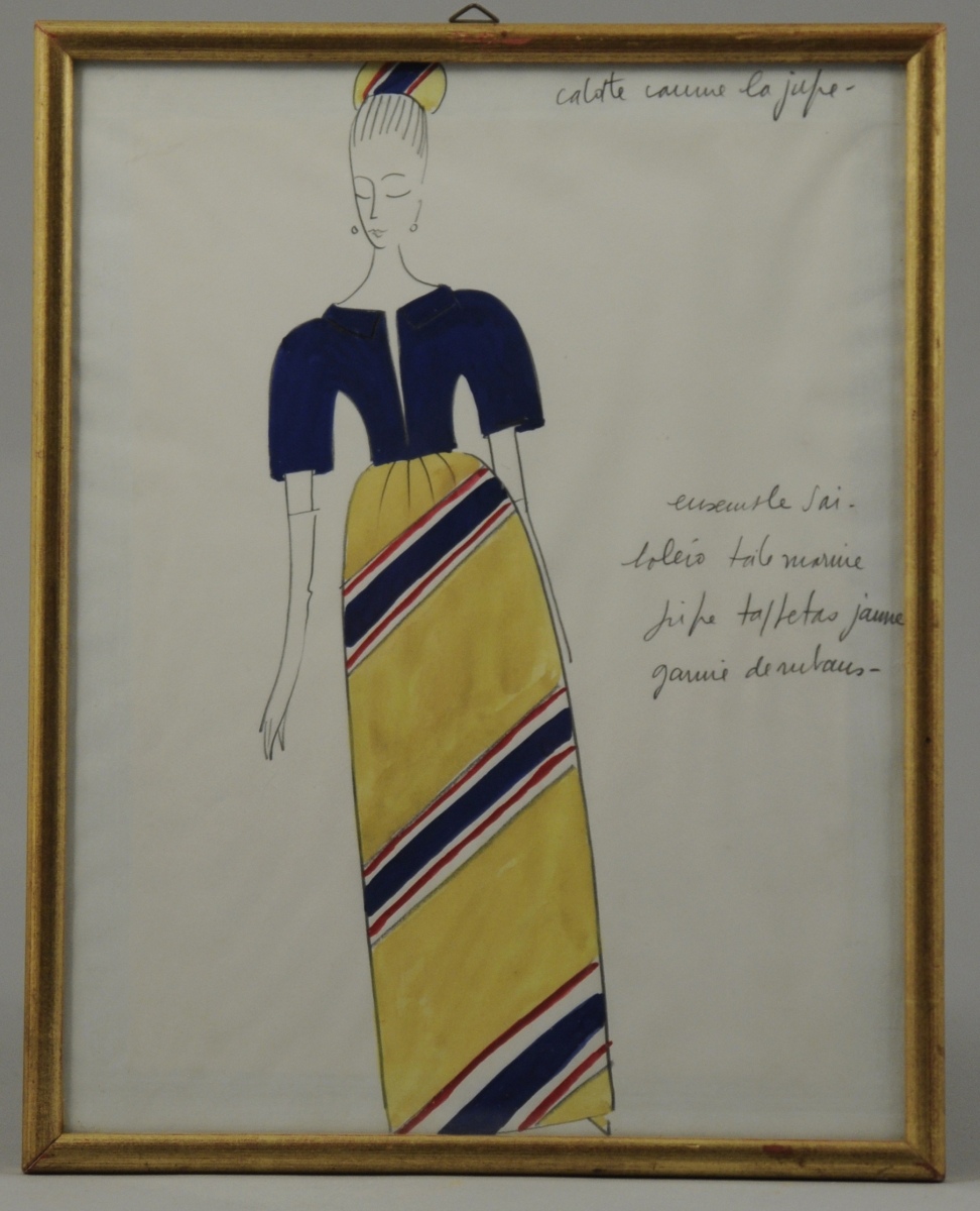 Dessin de MODE dans le genre de Pierre BALMAIN annoté "Ensemble soir / boléro tole marine / jupe taffetas jaune garnie de rubans." Début du XXème siècle.