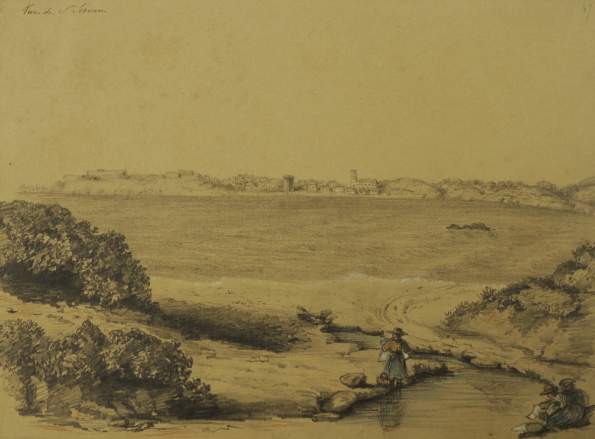 Chaque dessin porte une annotation manuscrite à la plume, indiquant le site représenté: Saint-Servan, Saint-Briac, Saint-Malo, Dinard, Montreuil, Pornic, Préfailles, Nîmes, Montfaucon, Avignon, Villeneuve-lès-Avignon,, Roquemaure, Châteauneuf-du-Pape, Mont Ventoux, Vaucluse, Carpentras, Orange, Cannes... Plusieurs vues sont datées de 1867.