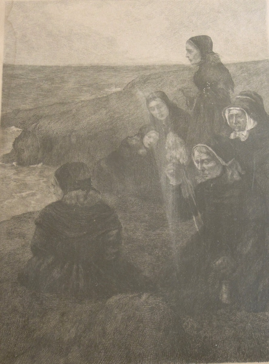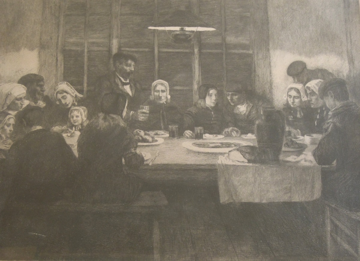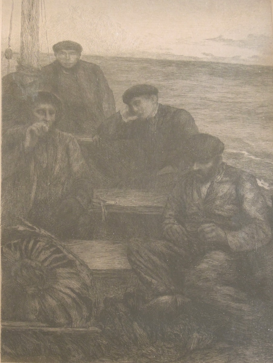 Repas de famille, pêcheur sur un bateau et fileuses face à la mer.