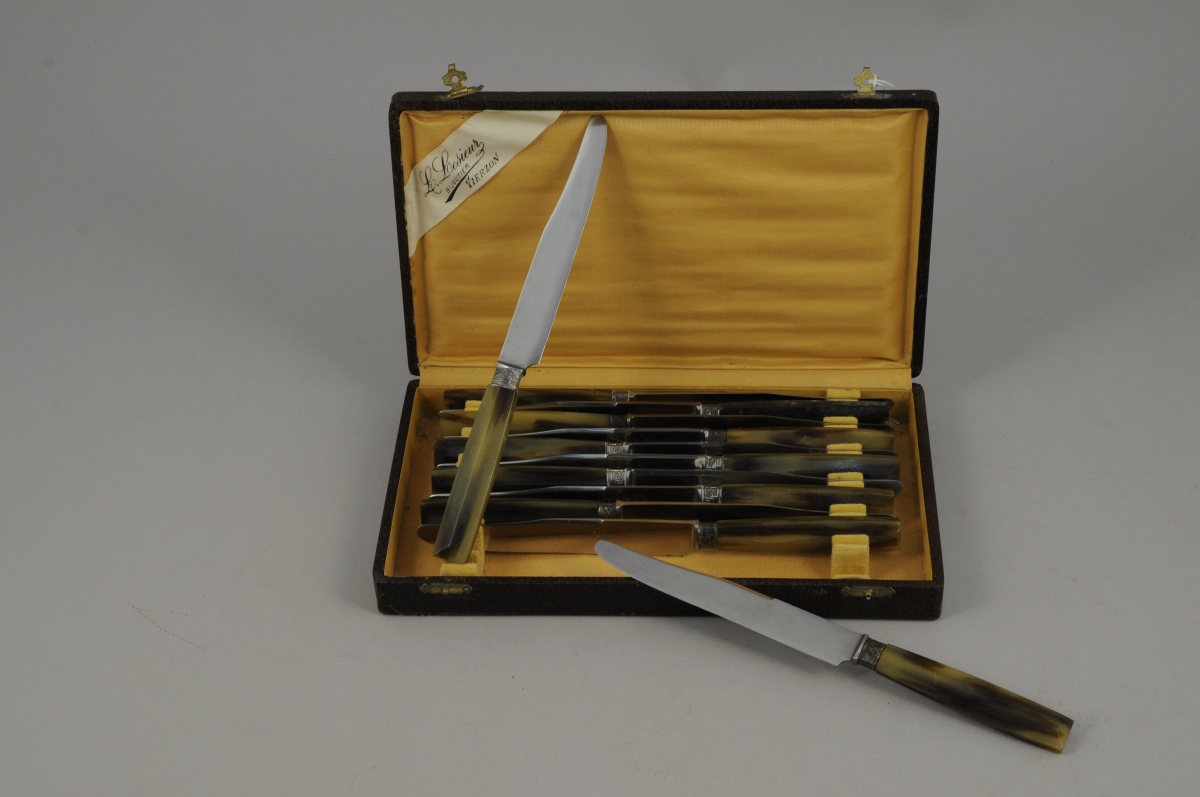 Suite de douze COUTEAUX, lame inox, manche corne, virole métal argenté à décor géométrique dans le goût Art Déco. Coffret. "LESIEUR / VIERZON" (usures et accidents aux manches)