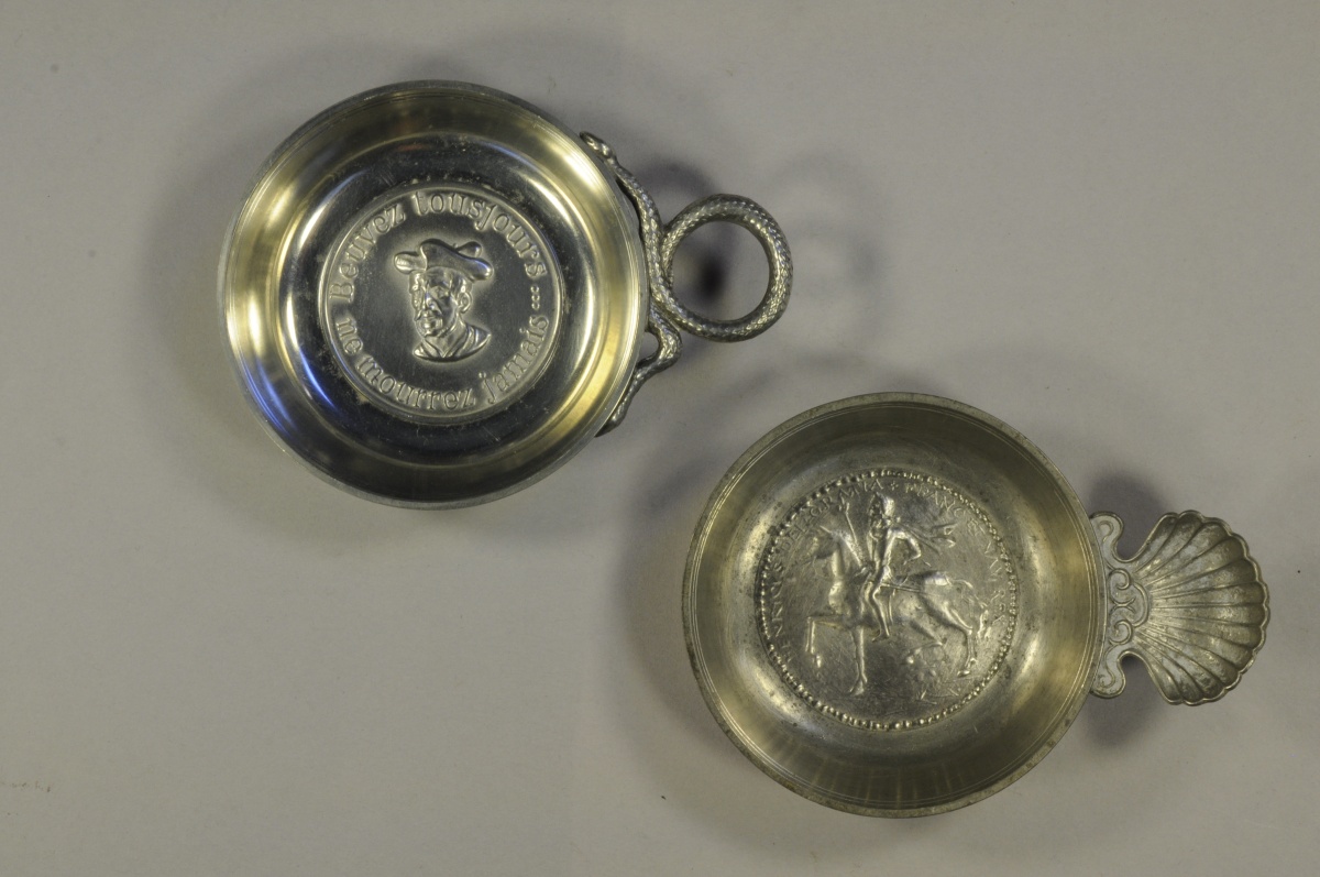 - Les Etains du Manoir, tastevin portant sur son bassin une effigie équestre du Roi Henri IV. La prise en forme de coquille. Larg. Avec la prise. 10,2 cm.