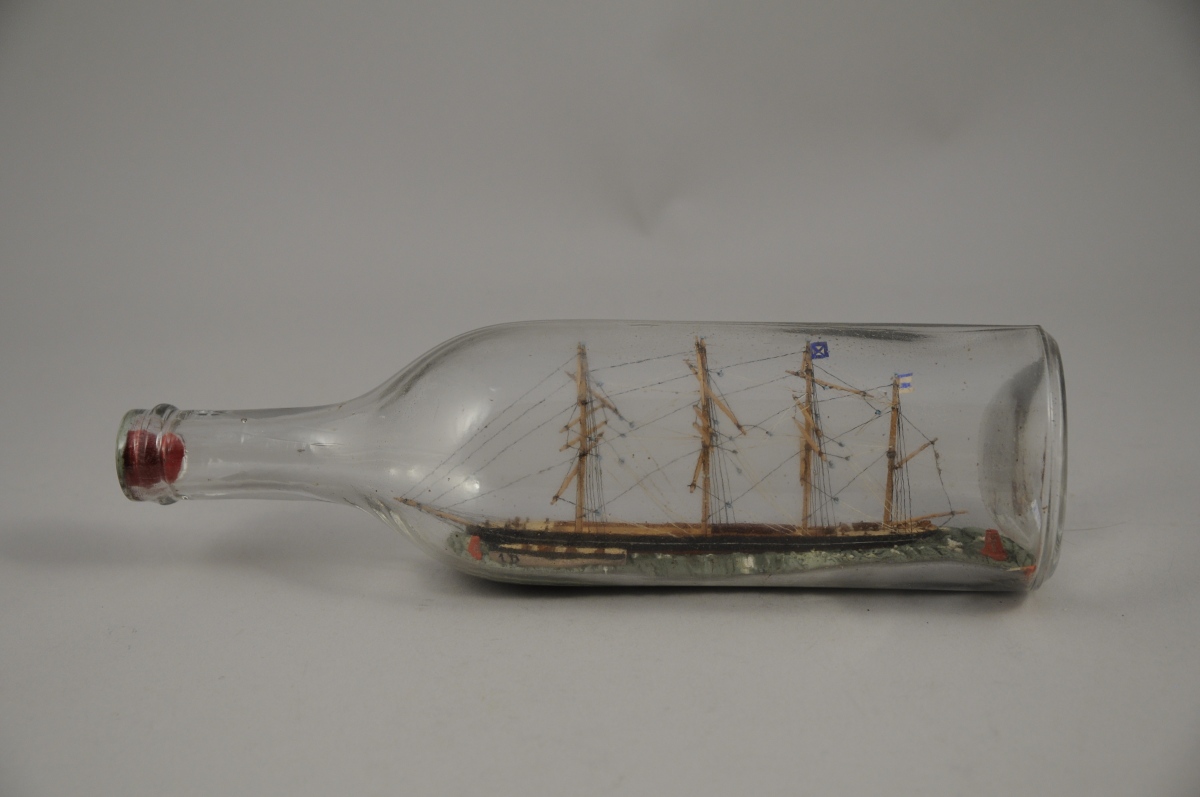 BATEAU BOUTEILLE. Quatre-mâts "Elisa" sur mer en mastic peint. Une barque accostée à bâbord de la proue. Long 31, Diam. 9 cm. (manques)