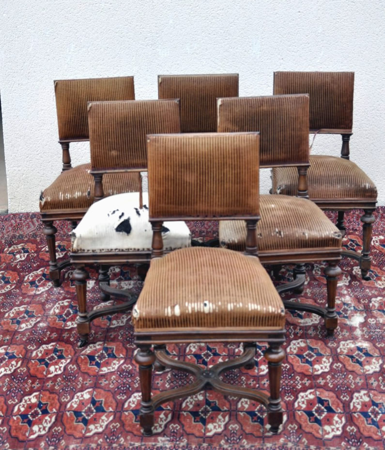 SUITE de SIX CHAISES en noyer mouluré et teinté. Dossier rectangulaire. Pieds et montants tournés en balustre. Entretoise en X. Style Louis XIII. Début XXème. Haut. 88,6, Larg. 46, Prof. 47,3 cm. (usures et accidents)