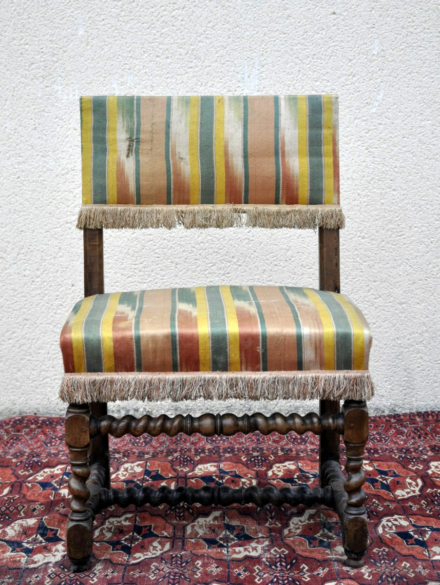 CHAISE à large assise en noyer tourné et teinté. Pieds antérieurs torsadés. Pieds postérieurs droits. Piètement en H. Style Louis XIII. Fin XIXème. Haut. 91,5, Larg. 59, Prof. 46 cm.