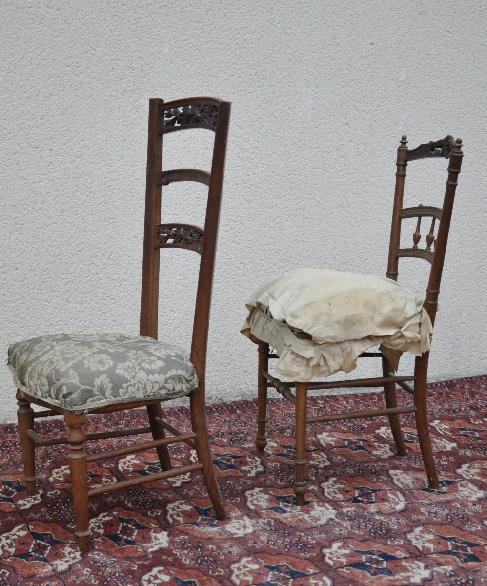 RÉUNION d'une chaise volante et d'une chaise de nourrice en noyer mouluré, tourné et sculpté. Dossiers ajourés de feuilles d'acanthe stylisées, de balustres et de guirlandes feuillagées. Début XXème. Haut. 94, Larg. 43, Prof. 39 cm et Haut. 85, Larg. 42, Prof. 38 cm. (garniture éventrée sur l'une, accidents et manques)
