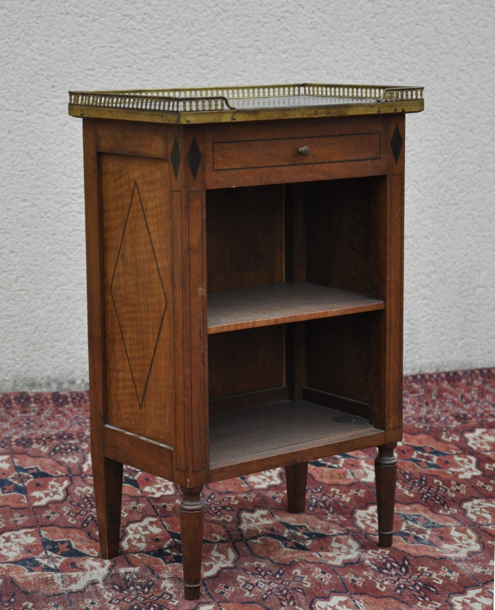 CHEVET en noyer à deux étagères, plateau en marbre ceint d'une galerie en laiton ajouré. Faux-tiroir en ceinture. Décor de losanges et filets en bois noirci. Pieds antérieur tournés, pieds postérieur gaine. Style Directoire, début XXème. Haut. 72,3, Larg. 41,5, Prof. 28,3 cm.