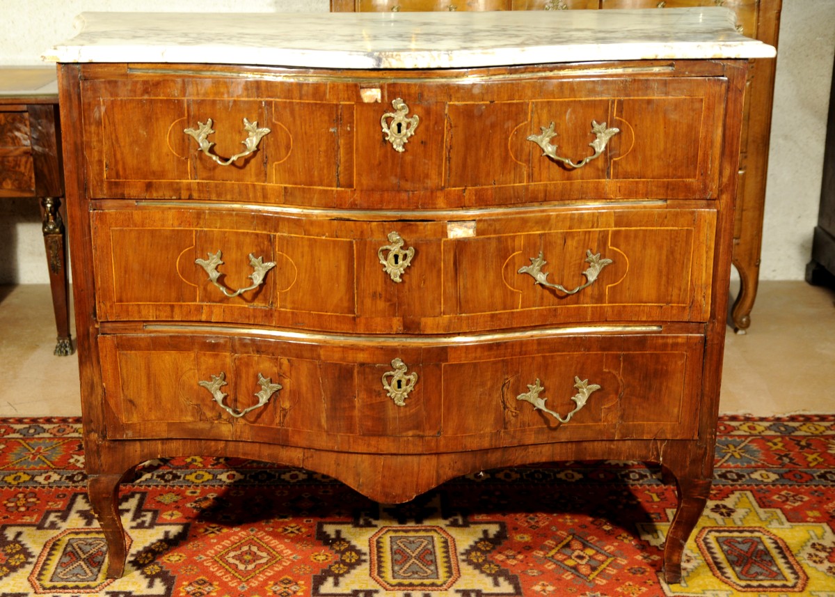 COMMODE à façade mouvementée et côtés évasés en bois de placage sur âme de résineux ouvrant en façade par trois tiroirs soulignés, sur les traverses, d'une cannelure de laiton. Garniture de bronzes en entrées de serrure et poignées de tirage de style rocaille. Ornementation de filets de bois clair. Elle repose sur quatre pieds cambrés. Plateau en marbre. Travail étranger ancien. Haut. 105,5, Larg. 136, Prof. 56,5 cm. (accidents, manques, soulèvements au placage, restaurations)