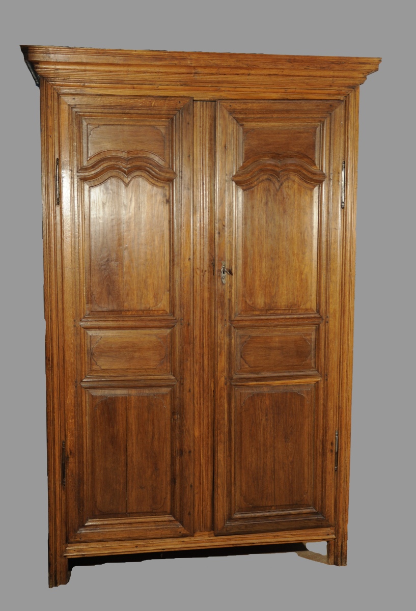 ARMOIRE en chêne et bois naturel mouluré et teinté, ouvrant par deux portes en façade, deux tiroirs et penderie à l'intérieur. Corniche, traverse et pieds droits. Travail du nord de la France. XIXème. Haut. 218,5, Larg. 130, Prof. 56 cm.