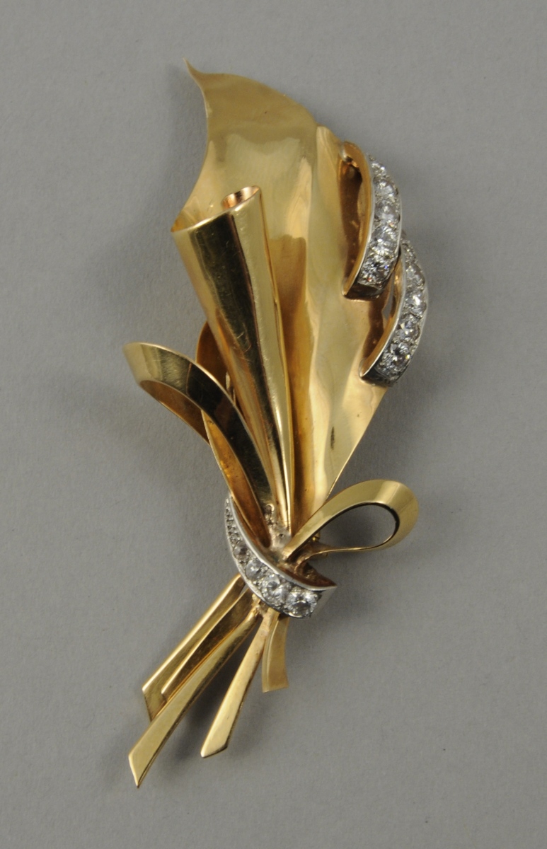 BROCHE en forme de feuille stylisée nouée d'un ruban à la base en or jaune. Ornée de 16 diamants. Les plus importants d'environ 0,10 carat. Poids brut: 15,9 g.