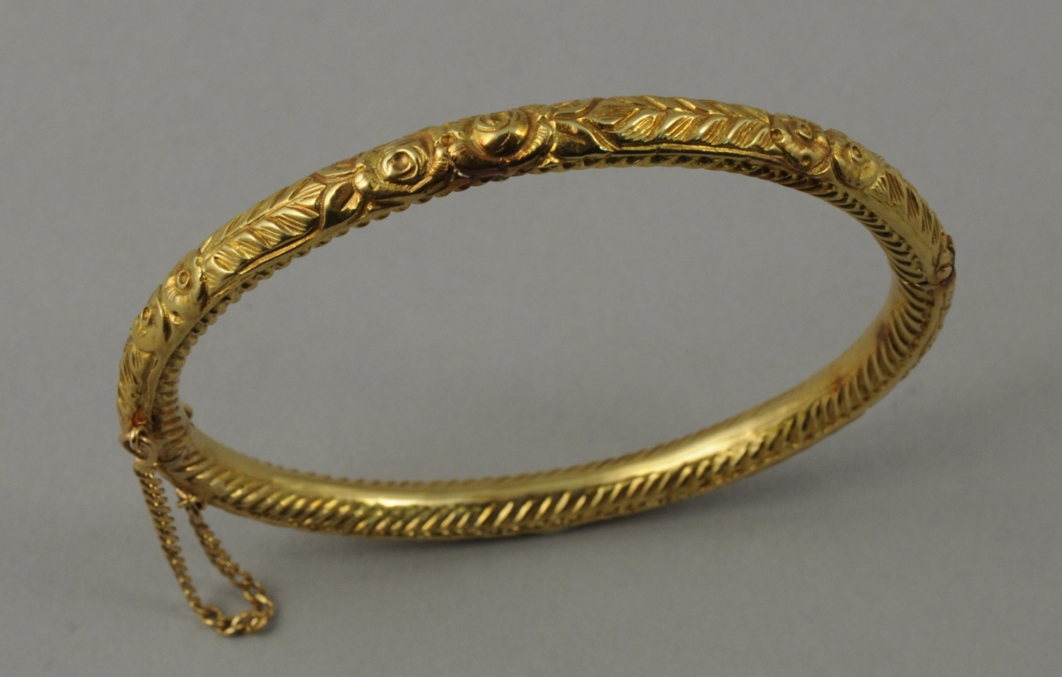 BRACELET rigide de forme ovale en or jaune. Décor de feuillage et de fleurs stylisés. Chaîne de sûreté. Long. 7,1 cm. Poids: 12,6 g.