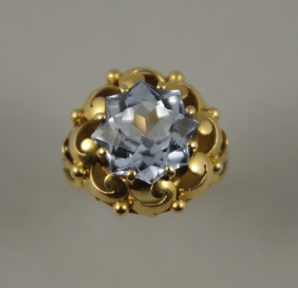 BAGUE en or sertie d'une aigue-marine taillée en étoile. Monture à décor ajouré d'une frise de postes agrémentée de petites perles d'or. Épaulement formé d'un ornement trilobé. Poids brut: 8g.