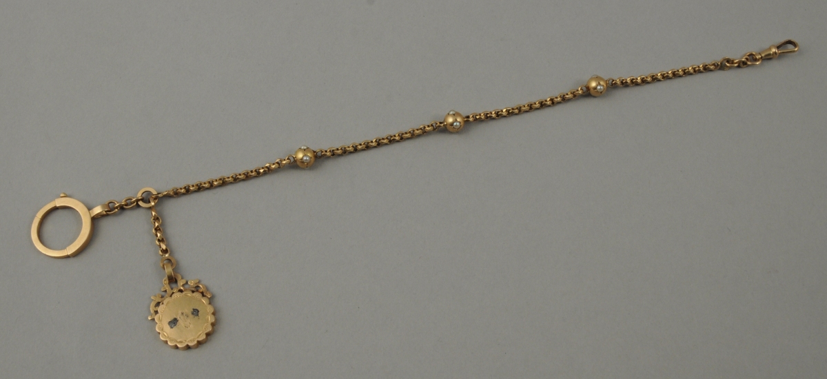 CHAÎNE de montre en or, maille forçât facetée et agrémentée de trois billes sertie de quatre petites perles blanches. Retient un pendentif de forme chantournée coiffé de volutes feuillagées. Long. 21,5 cm. Poids brut: 11,6 g.