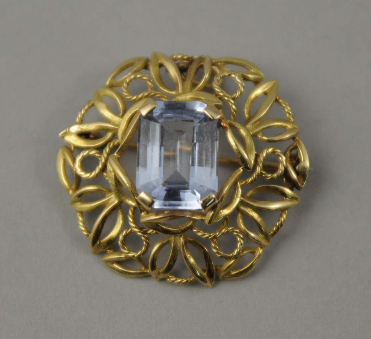 BROCHE de forme hexagonale contituée d'entrelacs de feuillages stylisés et cordelettes en or jaune. Sertie d'une aigue-marine de forme rectangulaire à pans coupés. Poids brut: 7,3 g.
