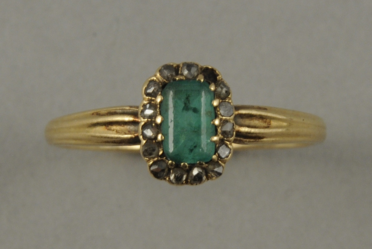 BAGUE en or jaune sertie d'une émeraude de taille baguette dans un encadrement de petits brillants. La monture ajourée en arcs de cercle. Travail ancien. Poids. 2,4 g.