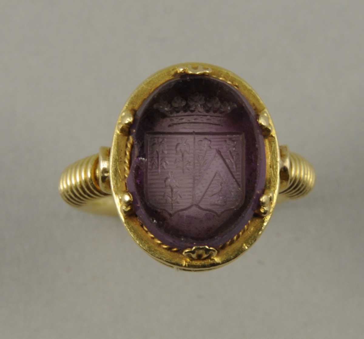 BAGUE CHEVALIÈRE en or sertie d'une intaille en amétyste ovale présentant des armes d'alliance sommées d'une couronne marquisale. Monture à décor d'un tressage. Poids brut 7,1 g.