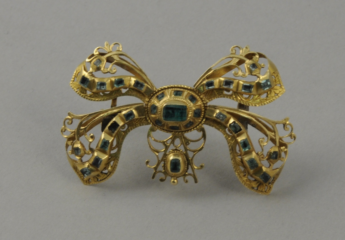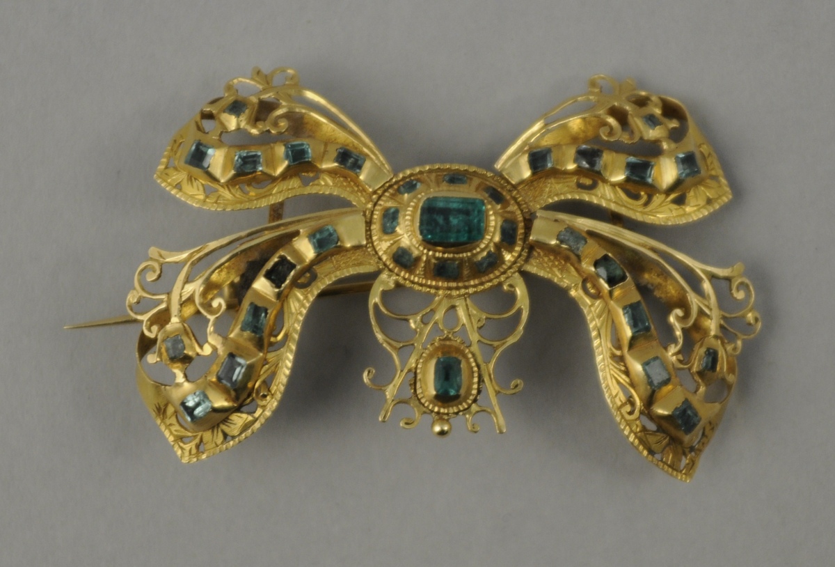 BROCHE en forme de ruban noué en or. Décor ajouré et gravé de volutes. Sertie de 31 émeraudes de forme rectangulaire. Travail ancien. Poids brut: 10 g.