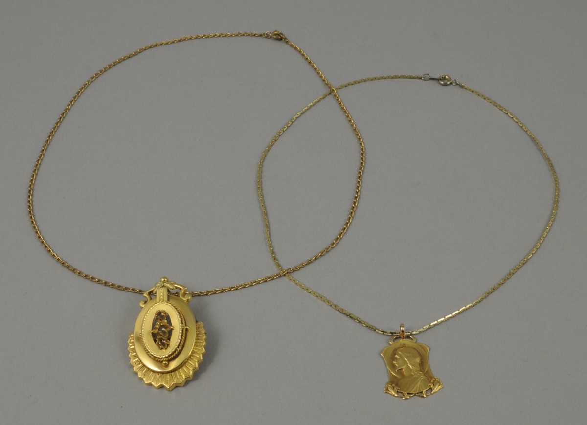 Une médaille représentant le Christ de profil souligné de deux hampes de lys ajourées. Gravée "Suzanne 15 8bre 1898" au verso. Poids: 2,6 g.