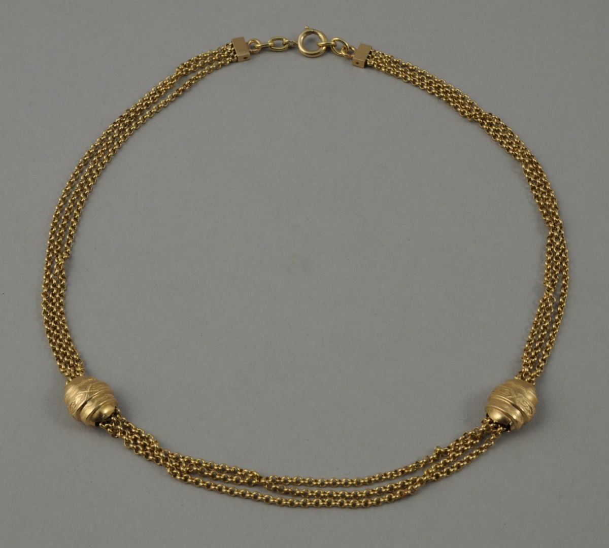COLLIER en or componsé de trois chaînes maille forcât à maillons ronds agrémentées de deux perles ovales en or gravé de vaguelettes et de motifs géométriques. Long. 39 cm. Poids: 19 g.