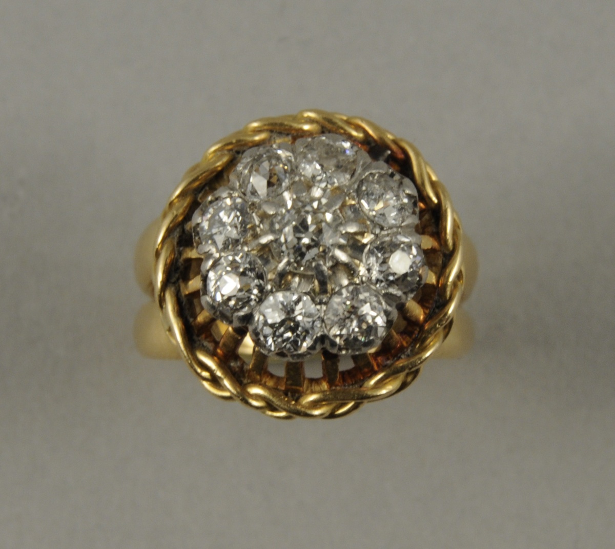 BAGUE marguerite en or jaune sertie d'un diamant d'environ 0,20 carat, entouré de huit diamants d'environ 0,15 chacun. Monture double à cordelette. Poids brut: 9,6 g.