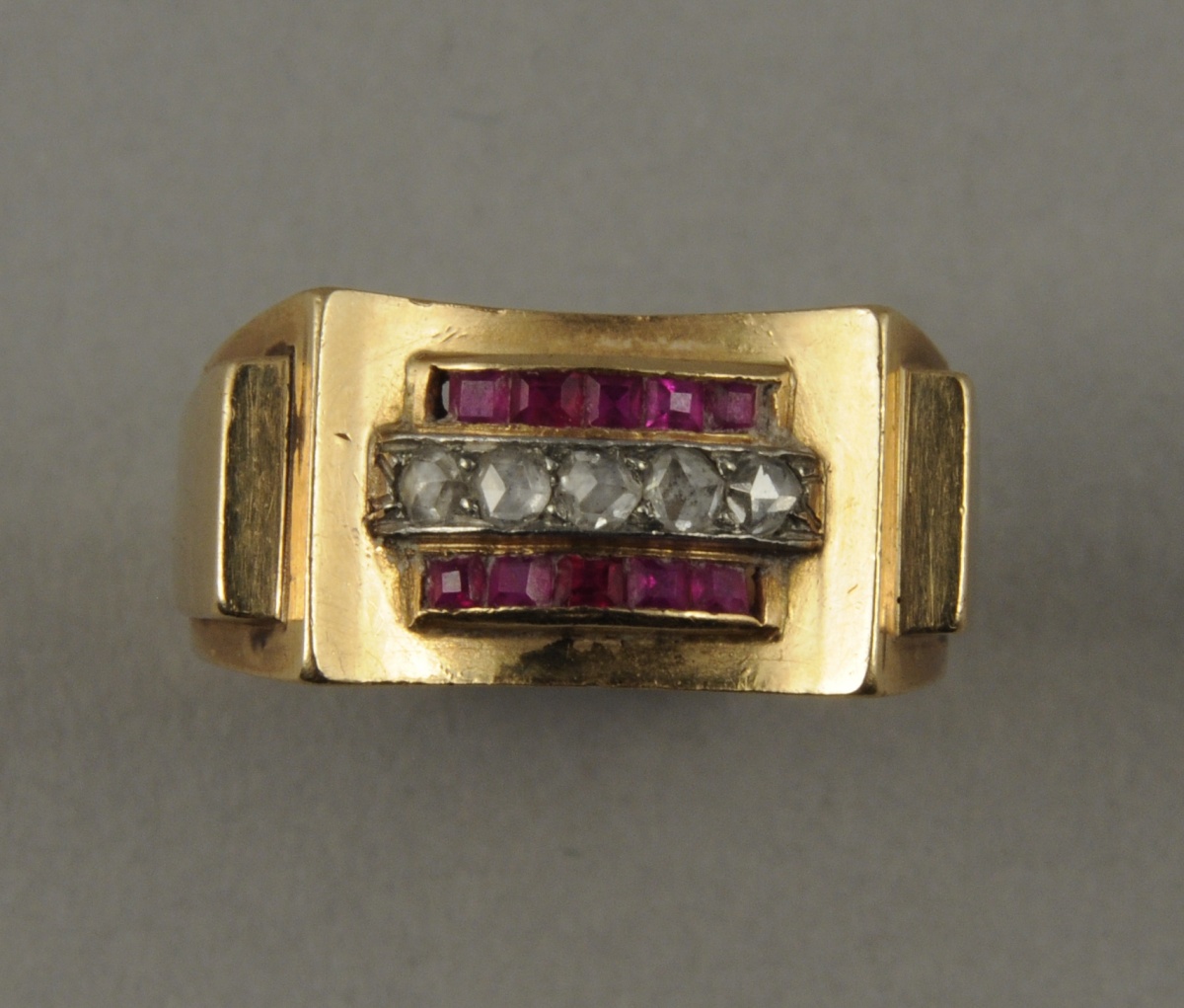 BAGUE en or jaune sertie de cinq diamants taille ancienne d'environ 0,4 carat flanqués de cinq rubis calibrés de chaque côté. Travail des années 1950. Poids brut: 6,3 g.