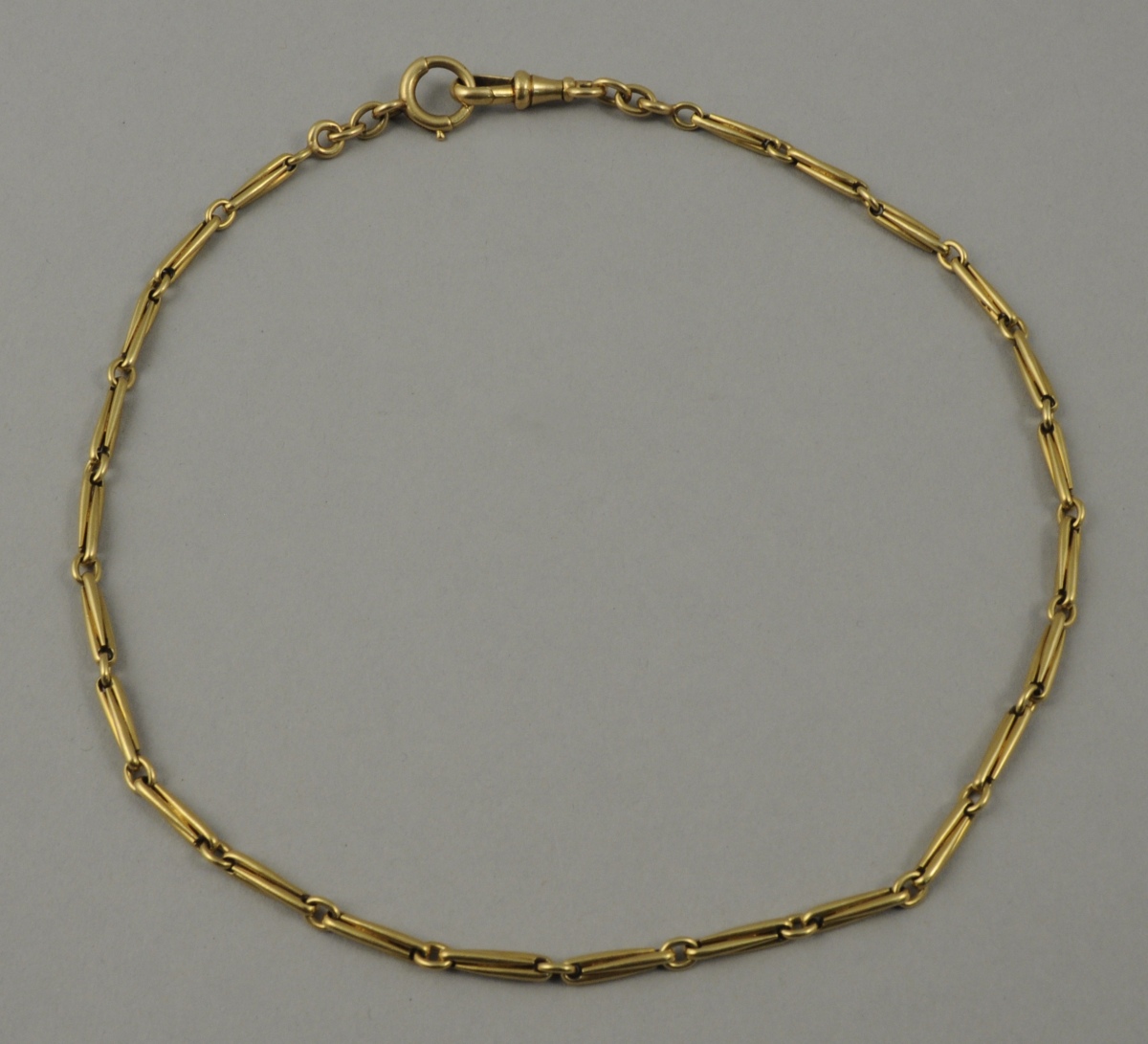 CHAÎNE giletière en or jaune. Maillons oblongs. Poinçon tête d'aigle. Long. 41,3 cm. Poids: 28,4 g.