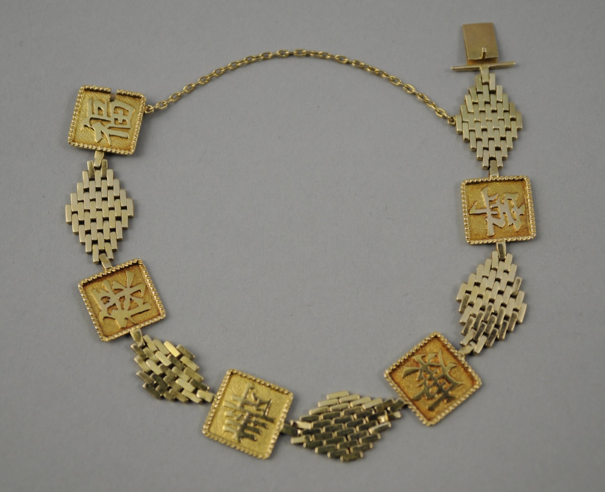 BRACELET en or jaune constitué de cinq plaques de forme carrée ornées d'un idéogramme chinois et séparées par cinq losanges constitués de maille souple. Chaîne de sûreté. Long. environ 17,5 cm. Poids: 18 g.