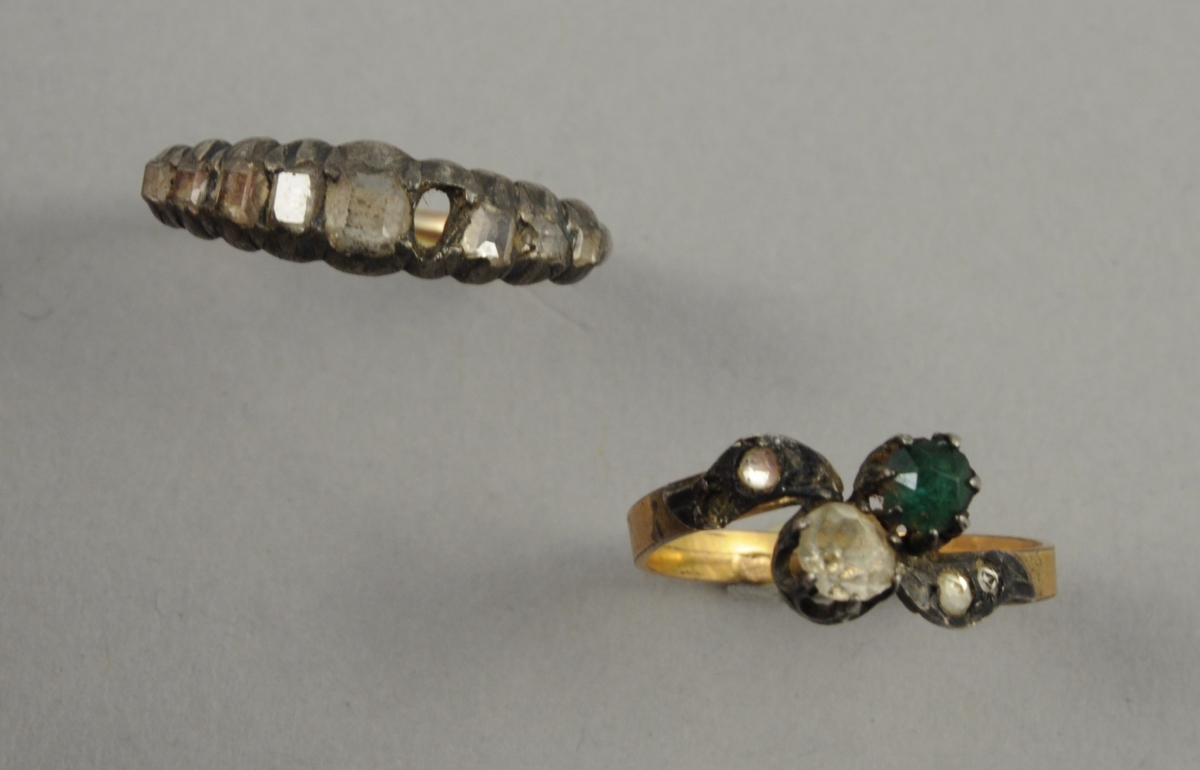 Une BAGUE VOUS ET MOI sertie d'une pierre blanche, d'une pierre verte et de brillants. Poids brut: 1,2 g.