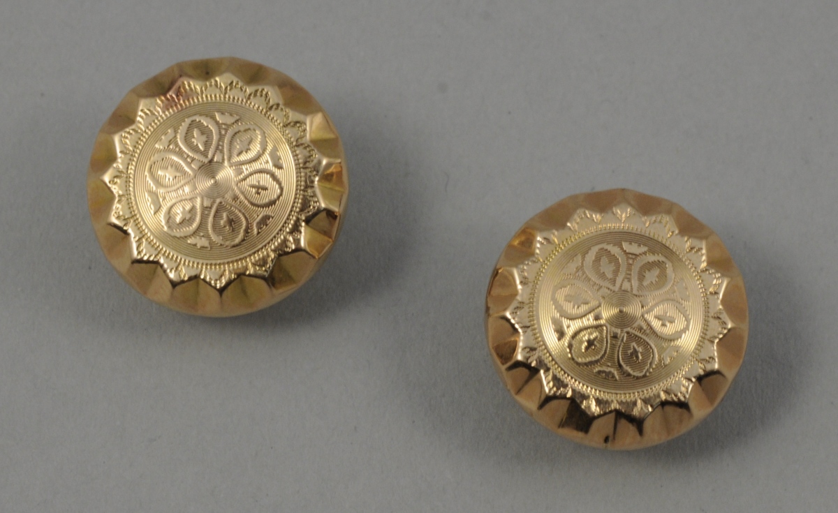 PAIRE de BOUTONS de MANCHETTE de forme ronde en or à décor d'une rosace sur un fond guilloché. Les contours facetés. Diam. 2 cm. Poids: 3,9 g.