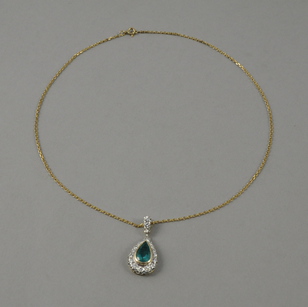 PENDENTIF en forme de poire centré d'une émeraude de Colombie de taille moderne d'environ 2 carats et entourée de 19 diamants de 0.90 carat environ. Suspendu à une chaîne maille forçat en or. Poids brut: 8,9 g.