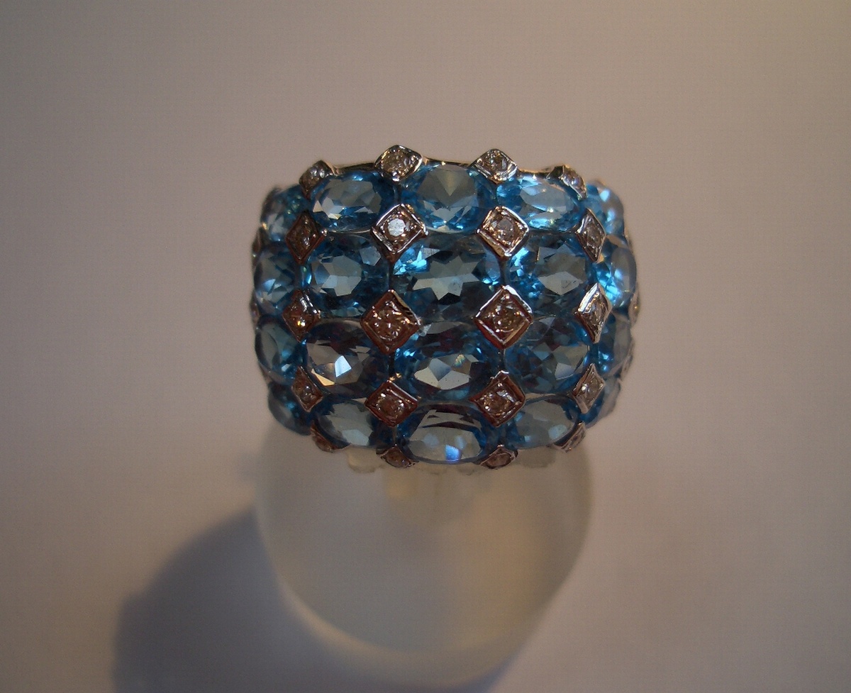 BAGUE boule en or blanc agrémentée de 20 topazes bleues taille ovale d'un total de 7 carats environ et de 30 diamants blancs taille moderne d'environ 0,30 carat. Poids brut: 9,1 g.