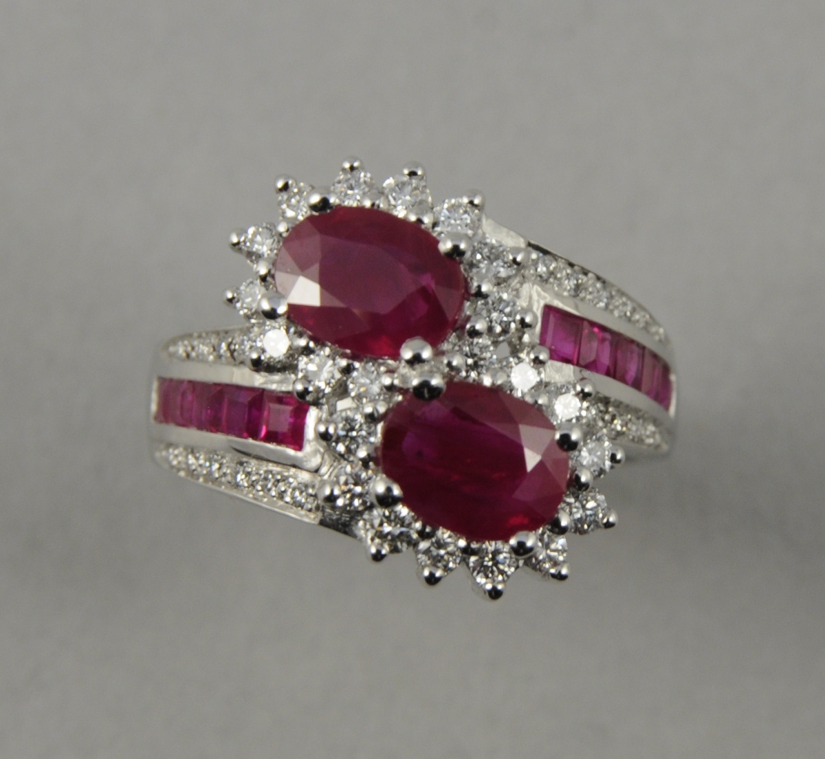 BAGUE VOUS ET MOI en or blanc ornée de deux rubis taille ovale de 2.35 carats agrémentés de dix rubis calibrés de 0.70 carat environ entourés de 42 diamants blancs taille moderne de 0.55 carats environ. Poids brut: 8,50 g.