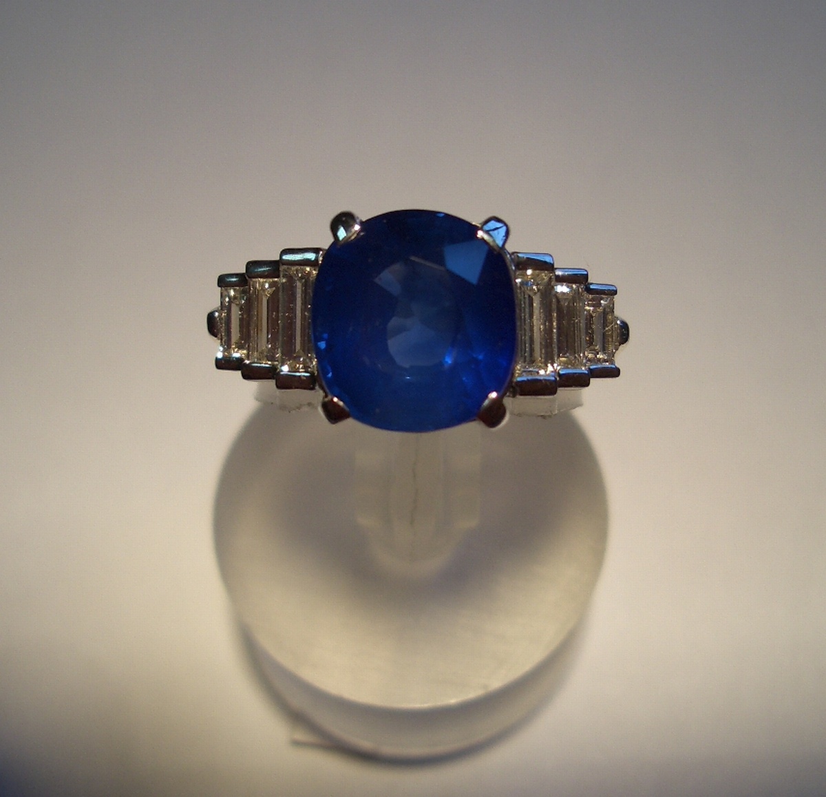 BAGUE en or blanc ornée d'un saphir taille ovale de 4,57 carats agrémenté de six diamants blancs taille baguette de 0.50 carat environ. Poids brut: 6,60 g.