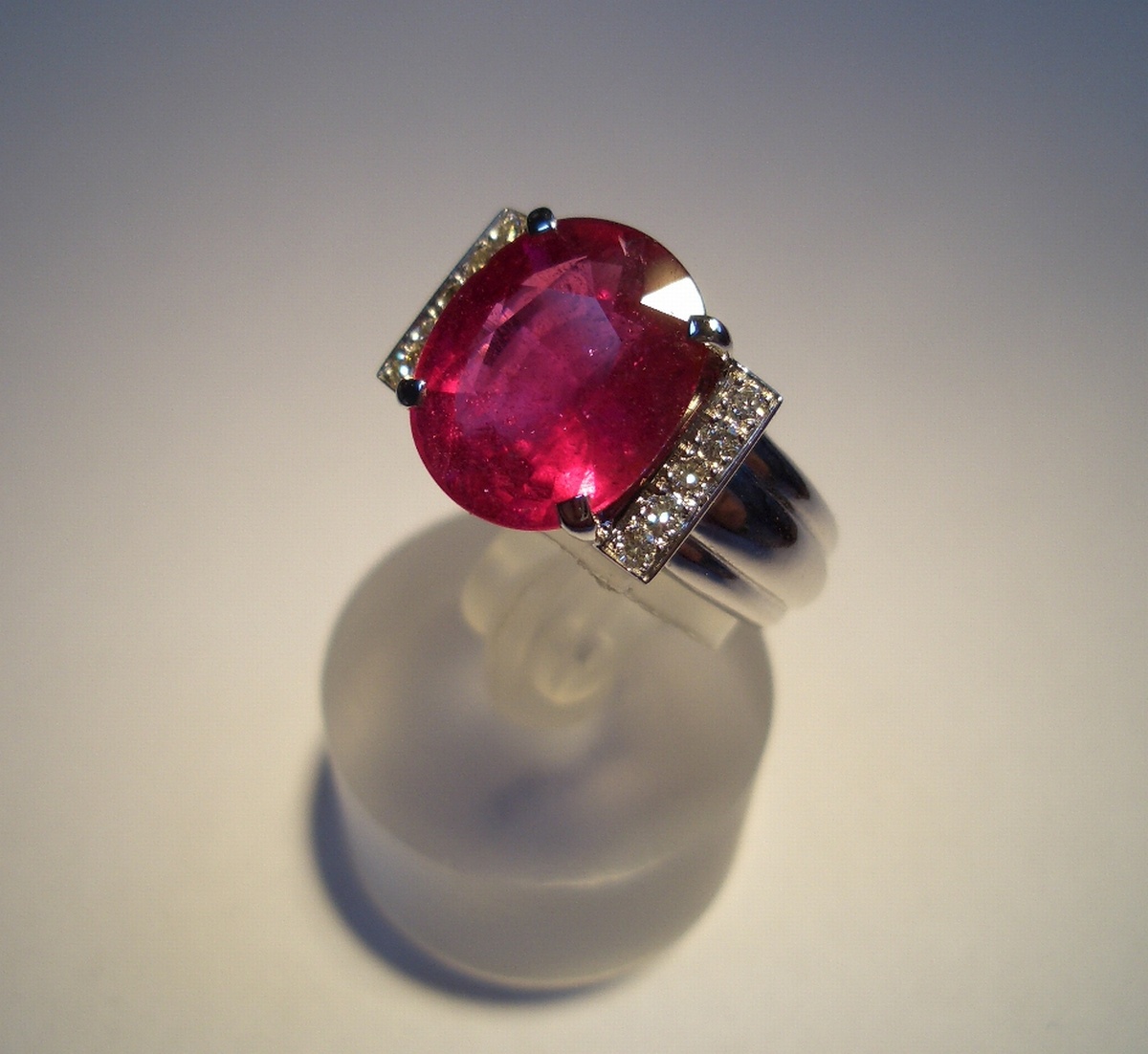BAGUE jonc godronné en or blanc ornée d'une tourmaline rose taille ovale de 5,60 carats environ (petite égrisure) agrémentée de dix diamants blancs taille moderne de 0.20 carat environ. Poids brut: 9,9 g.
