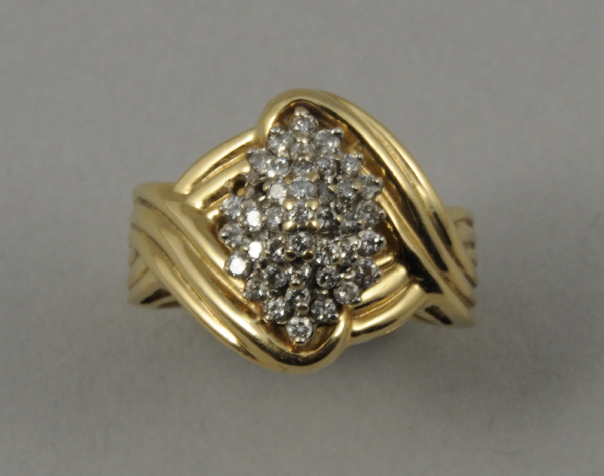 BAGUE "dôme" en or jaune ornée d'un pavage de petits diamants ronds. Poids brut: 8 g
