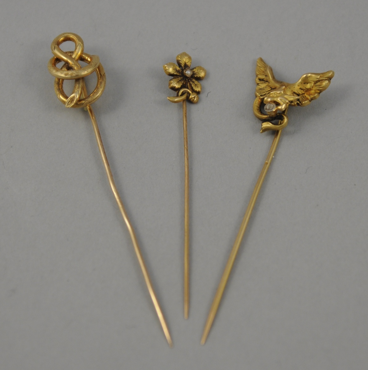TROIS ÉPINGLES de cravatte en or: pensée ornée d'une demi-perle, noeud de branchage, guivre aux ailes déployées retenant une pierre blanche. Poids brut: 5,4 g.