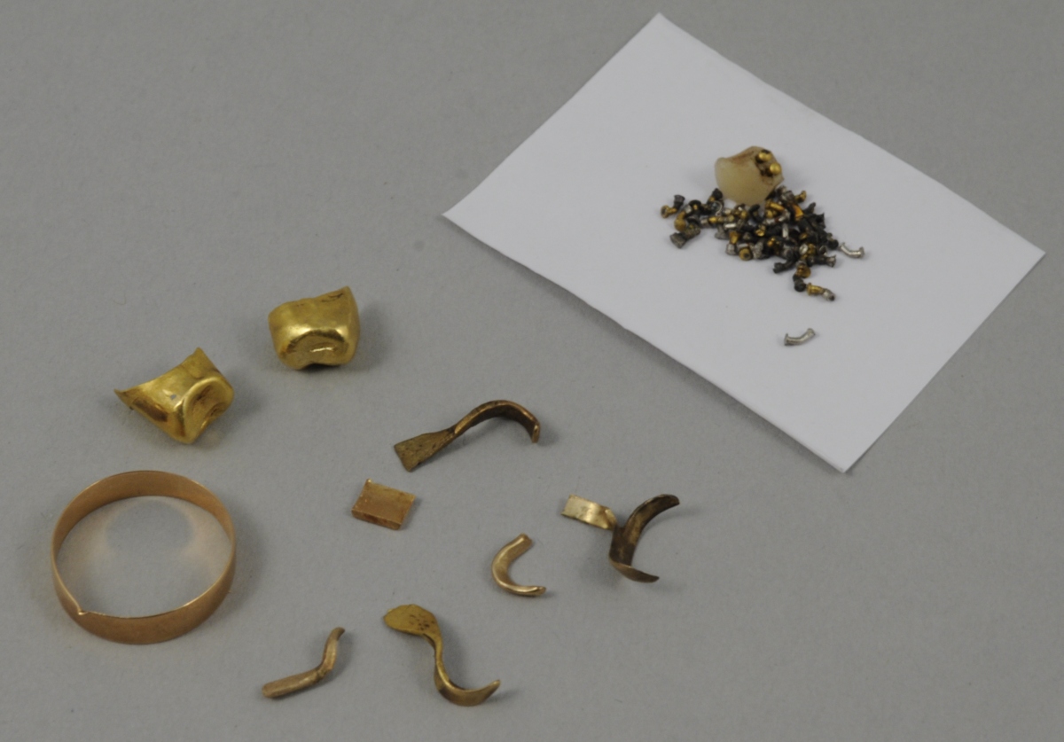 OR À LA CASSE: alliance, deux dents et six débris dentaires. Poids: 6,1 g.