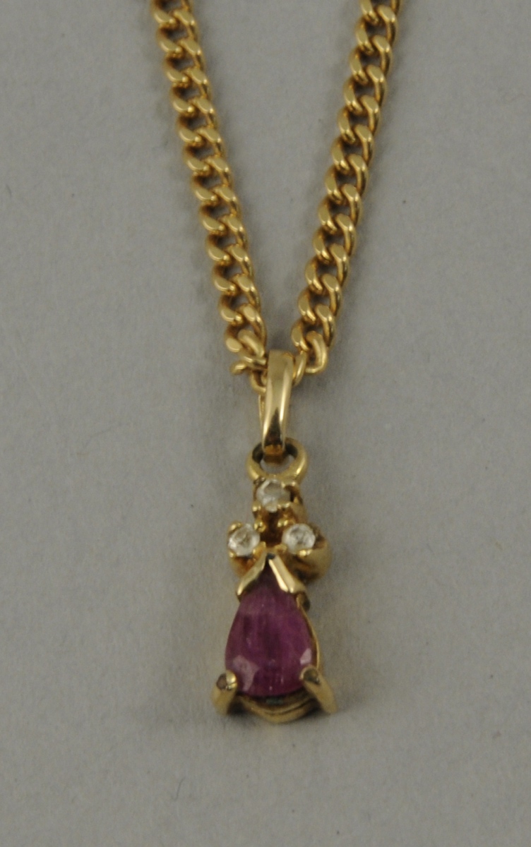 CHAÎNE en or jaune, maille gourmette et PENDENTIF en or jaune serti d'une pierre rose taille poire et de trois brillants. Long. 53,5 et 1,9 cm. Poids: 8,6 et poids brut: 0,8 g.