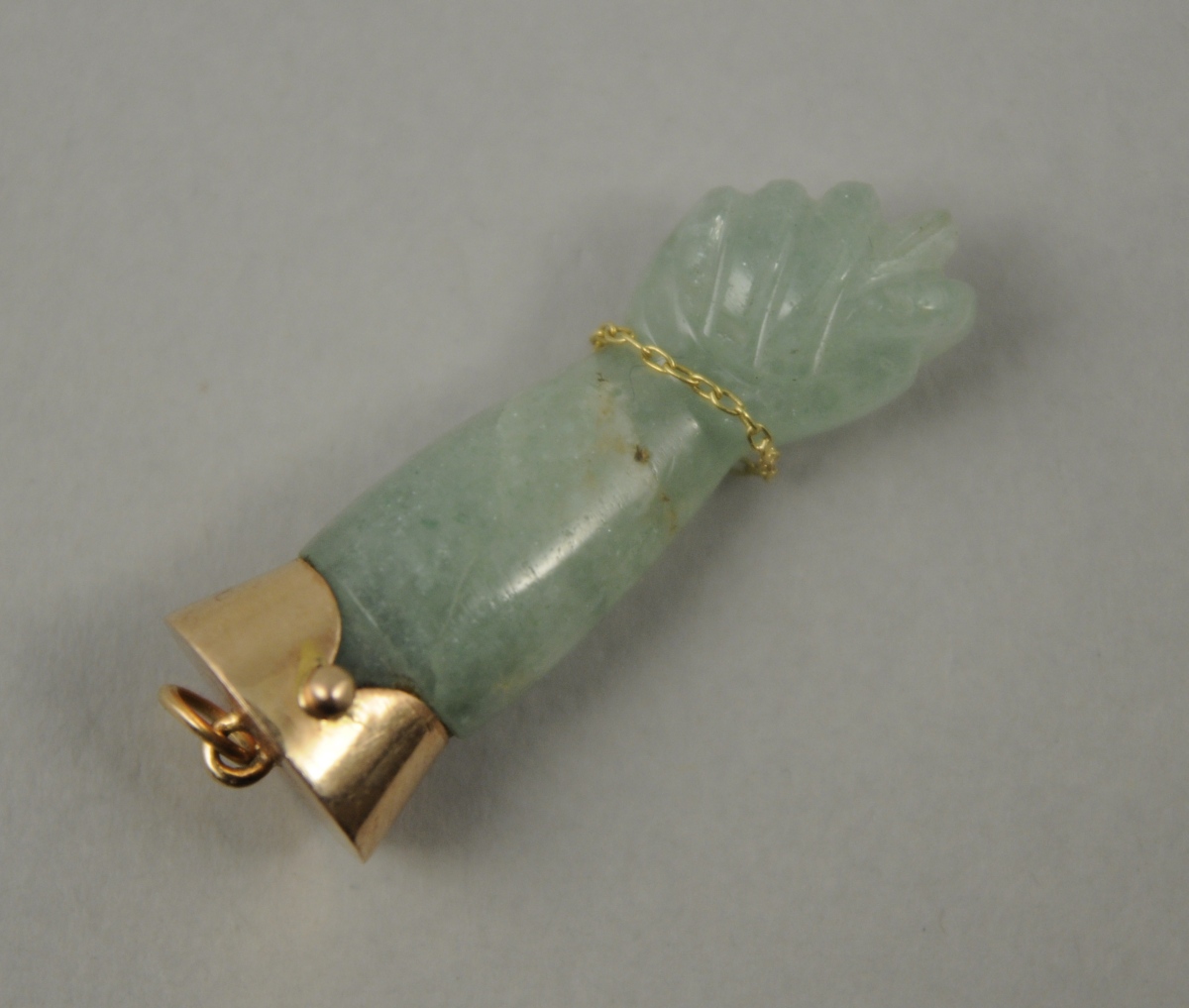 PENDENTIF en JADE SCULPTÉ figurant un avant-bras, poing serré, agrémenté d'un fin bracelet en métal doré. Monture en or. Long. 3,6 cm. Poids brut: 5,4 g.