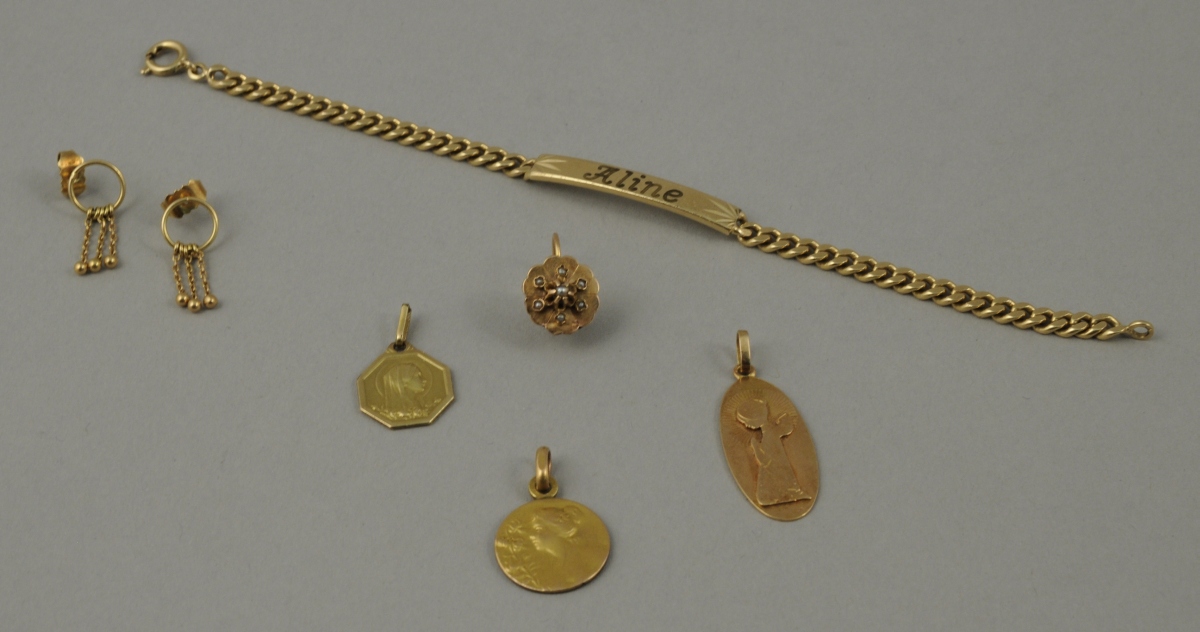 Une médaille de forme ovale en or représentant un ange auréolé priant, agenouillé, sur un fond guilloché. Le verso porte la mention "Catherine 31-5-67". Poinçon tête d'aigle. Poids: 2,3 g.