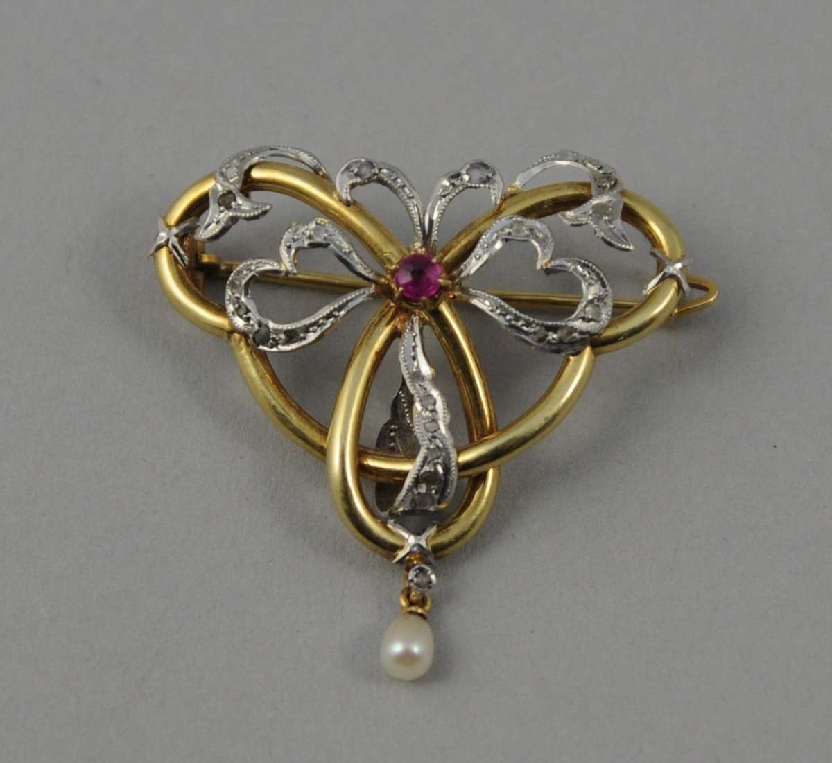 BROCHE adoptant la forme d'un nœud en or jaune et blanc et retenant une perle piriforme. Les éléments en or blanc pavés de diamants. Centrée d'un rubis de taille ancienne d'environ 0,10 carat. Poids brut: 5,1 g.